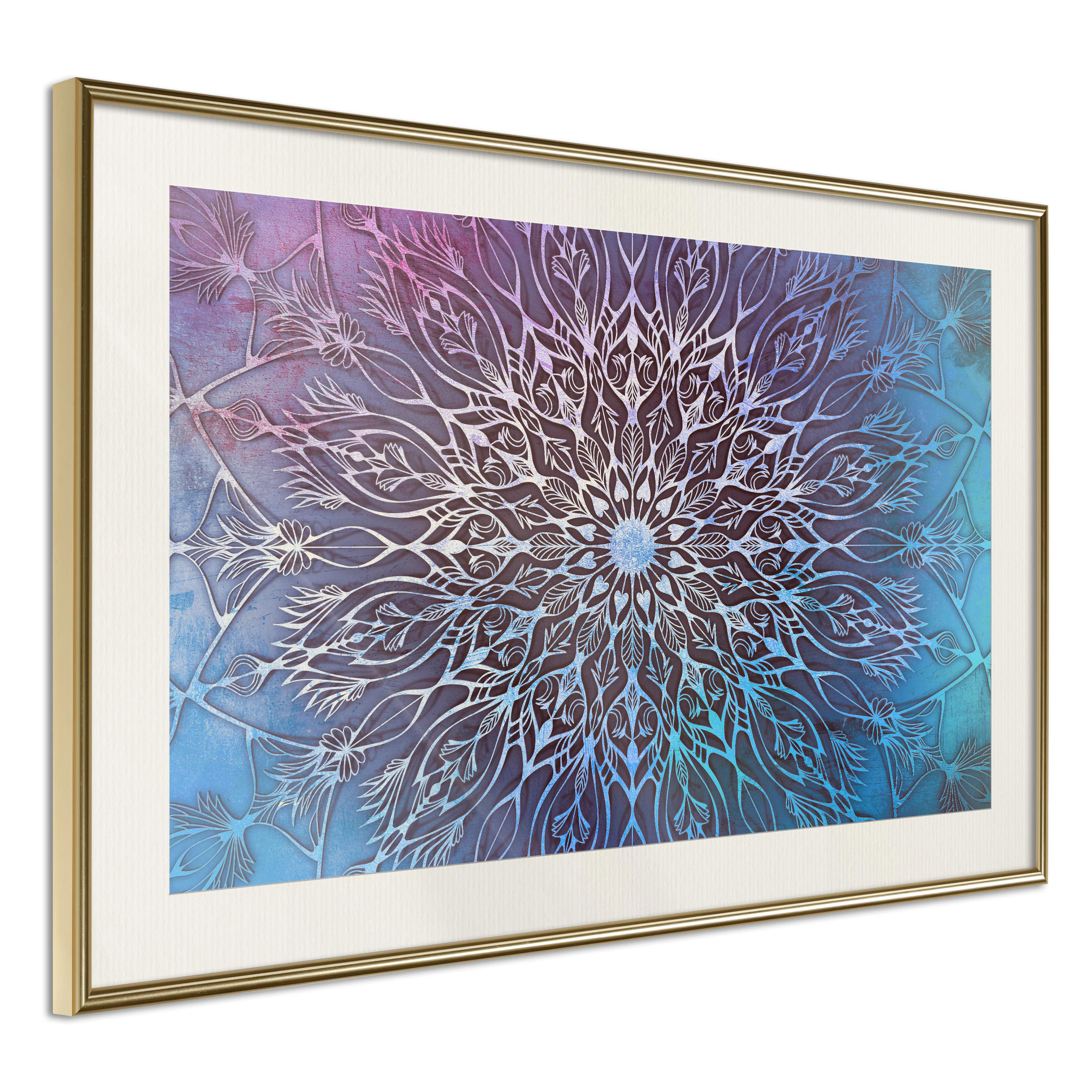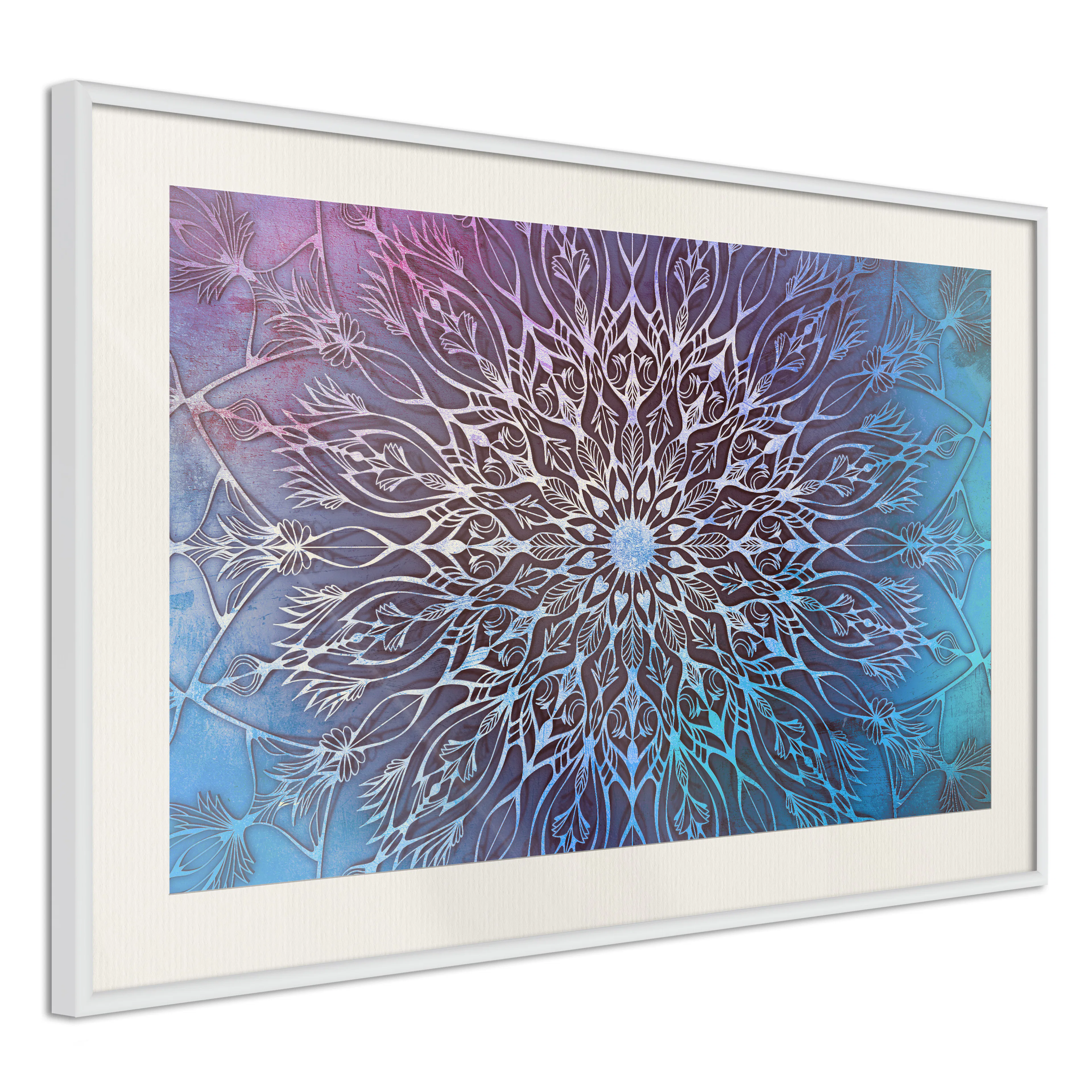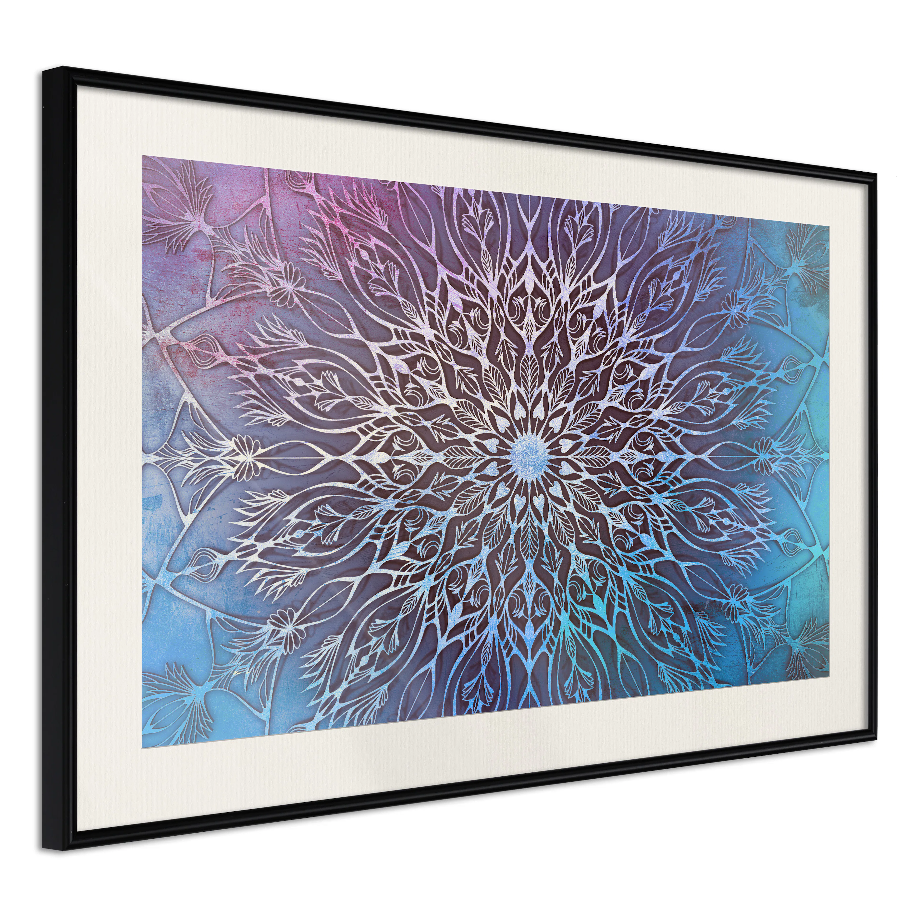Passepartouten i écru betonar färgern på affischen och skapar en extra kontrast mellan grafiken, ramen och väggen. Dessutom ger den ramen ett svagt tredimensionellt intryck och fungerar även som ett skyddslager som ytterligare skyddar afischen. Affischen är säkrad med akrylglas och en hänganordning finns på ramens baksida.