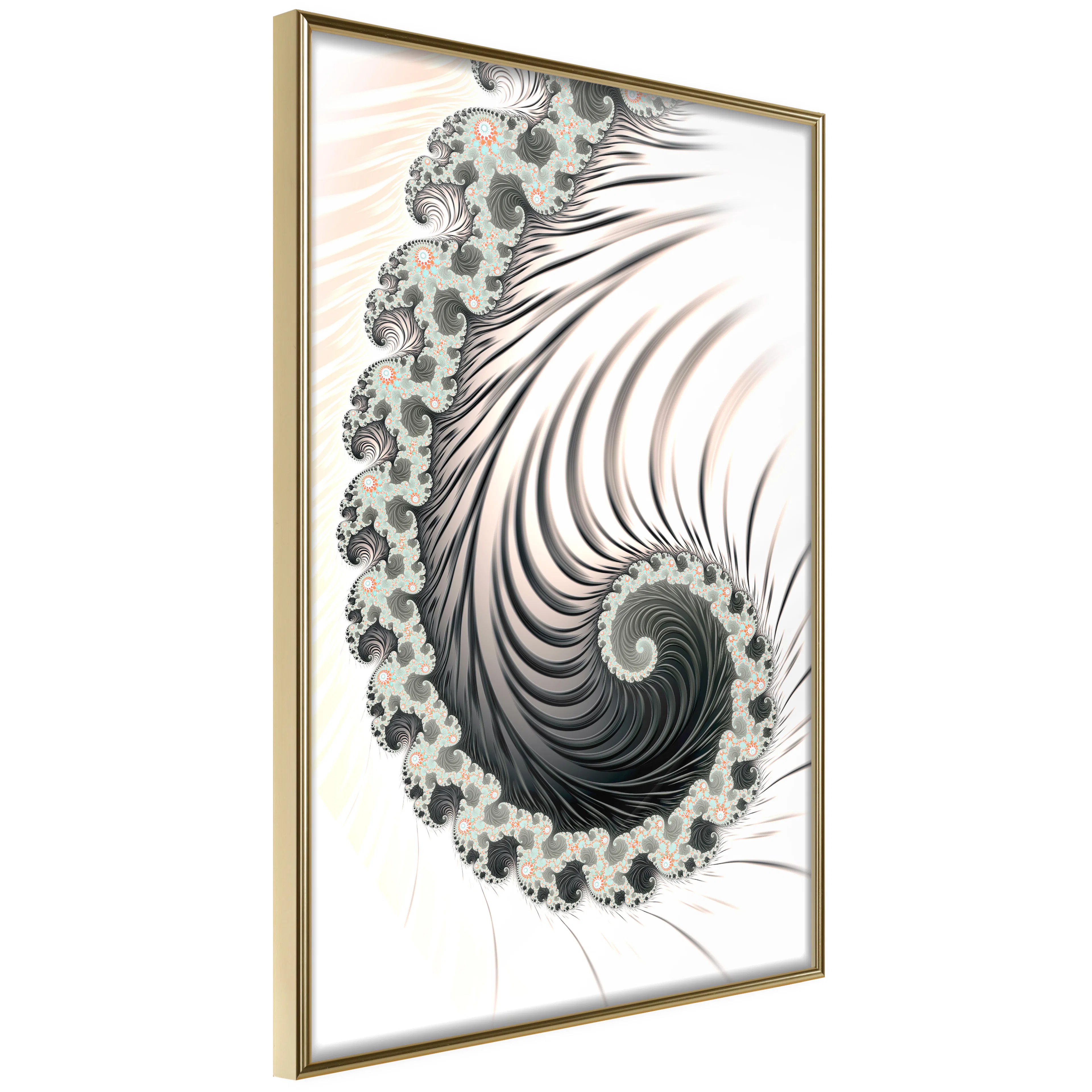 Passepartouten i écru betonar färgern på affischen och skapar en extra kontrast mellan grafiken, ramen och väggen. Dessutom ger den ramen ett svagt tredimensionellt intryck och fungerar även som ett skyddslager som ytterligare skyddar afischen. Affischen är säkrad med akrylglas och en hänganordning finns på ramens baksida.