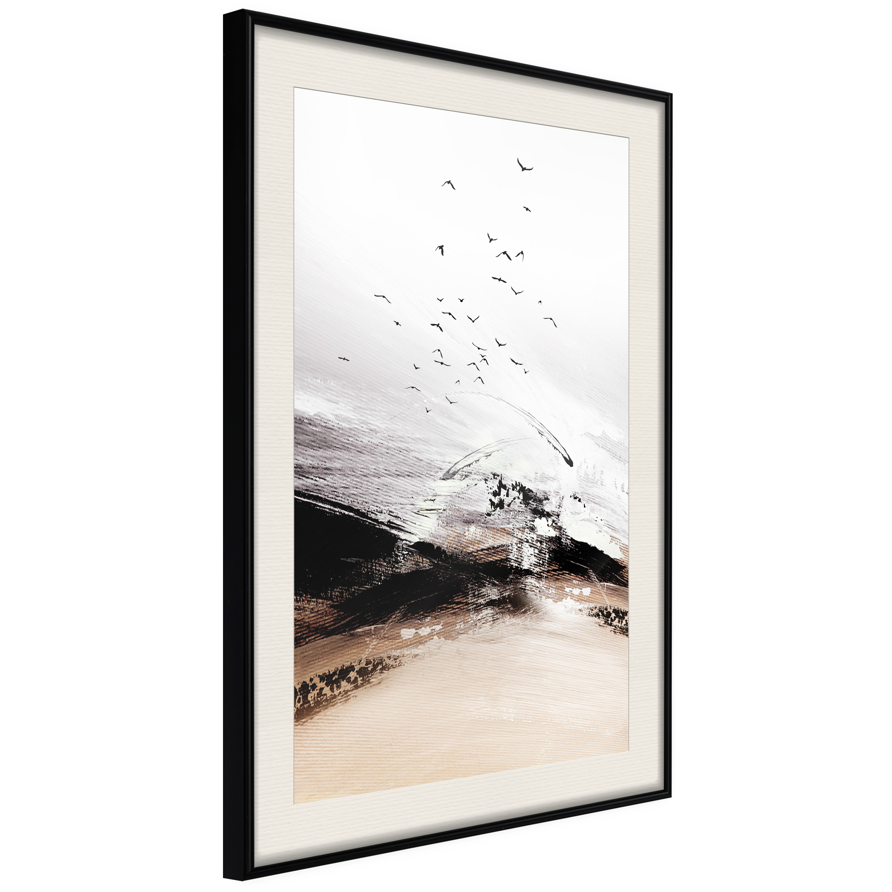 Passepartouten i écru betonar färgern på affischen och skapar en extra kontrast mellan grafiken, ramen och väggen. Dessutom ger den ramen ett svagt tredimensionellt intryck och fungerar även som ett skyddslager som ytterligare skyddar afischen. Affischen är säkrad med akrylglas och en hänganordning finns på ramens baksida.