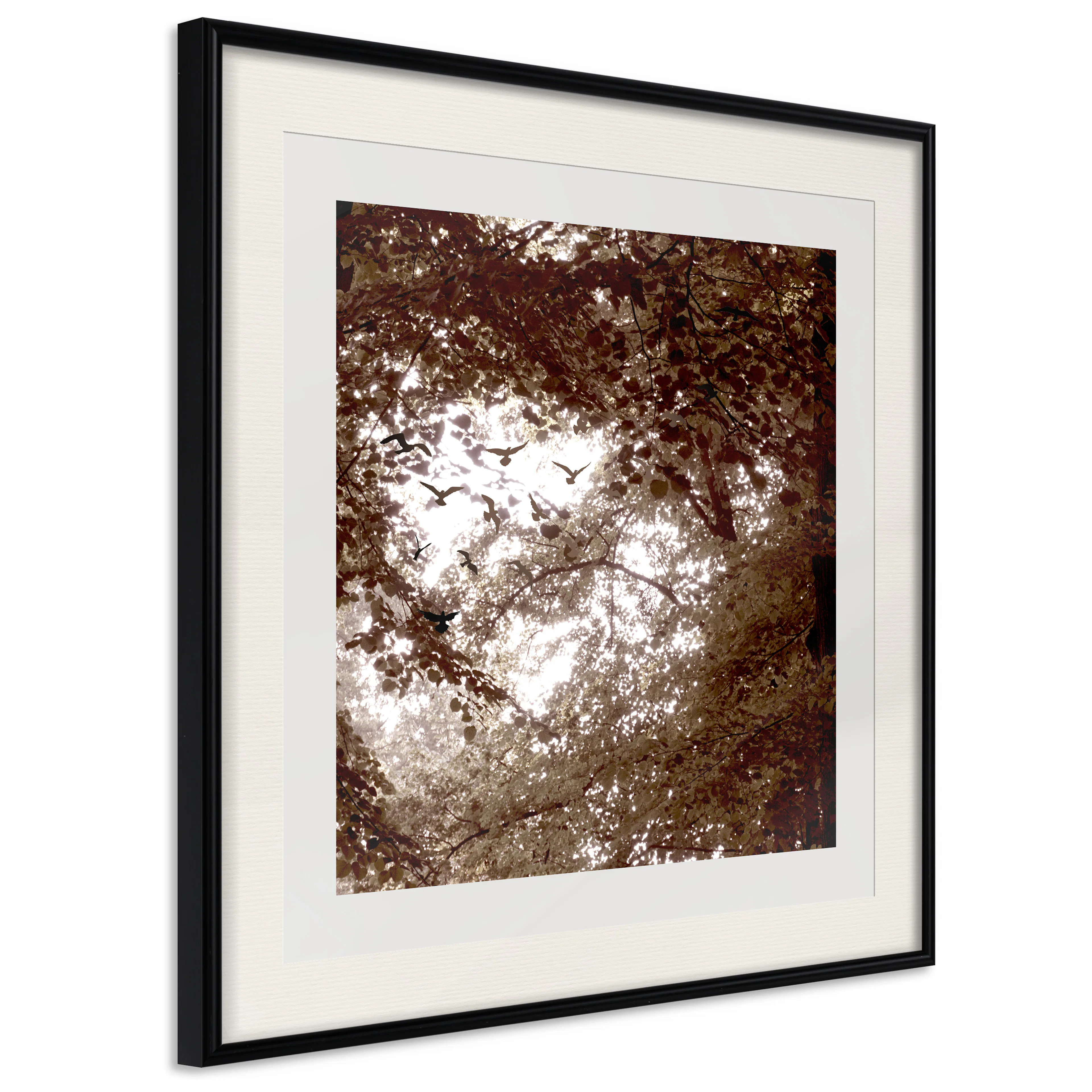Passepartouten i écru betonar färgern på affischen och skapar en extra kontrast mellan grafiken, ramen och väggen. Dessutom ger den ramen ett svagt tredimensionellt intryck och fungerar även som ett skyddslager som ytterligare skyddar afischen. Affischen är säkrad med akrylglas och en hänganordning finns på ramens baksida.