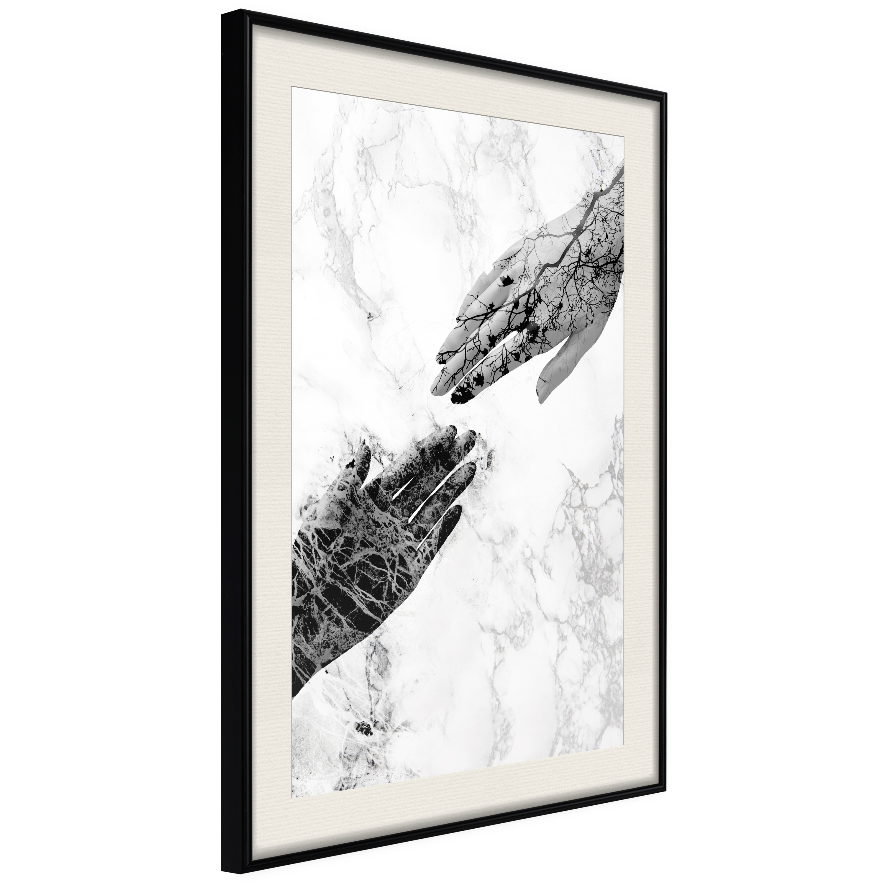 Passepartouten i écru betonar färgern på affischen och skapar en extra kontrast mellan grafiken, ramen och väggen. Dessutom ger den ramen ett svagt tredimensionellt intryck och fungerar även som ett skyddslager som ytterligare skyddar afischen. Affischen är säkrad med akrylglas och en hänganordning finns på ramens baksida.