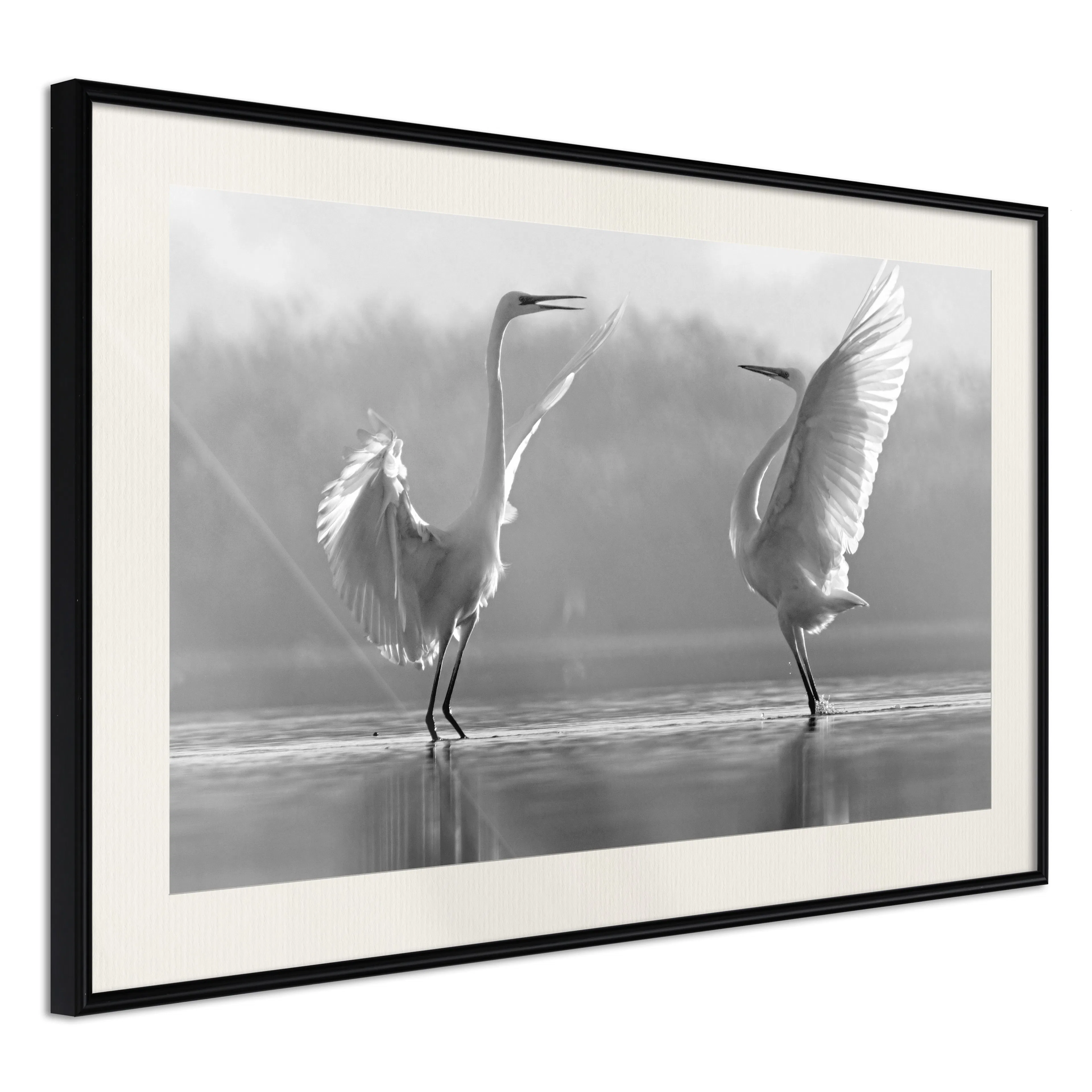 Passepartouten i écru betonar färgern på affischen och skapar en extra kontrast mellan grafiken, ramen och väggen. Dessutom ger den ramen ett svagt tredimensionellt intryck och fungerar även som ett skyddslager som ytterligare skyddar afischen. Affischen är säkrad med akrylglas och en hänganordning finns på ramens baksida.