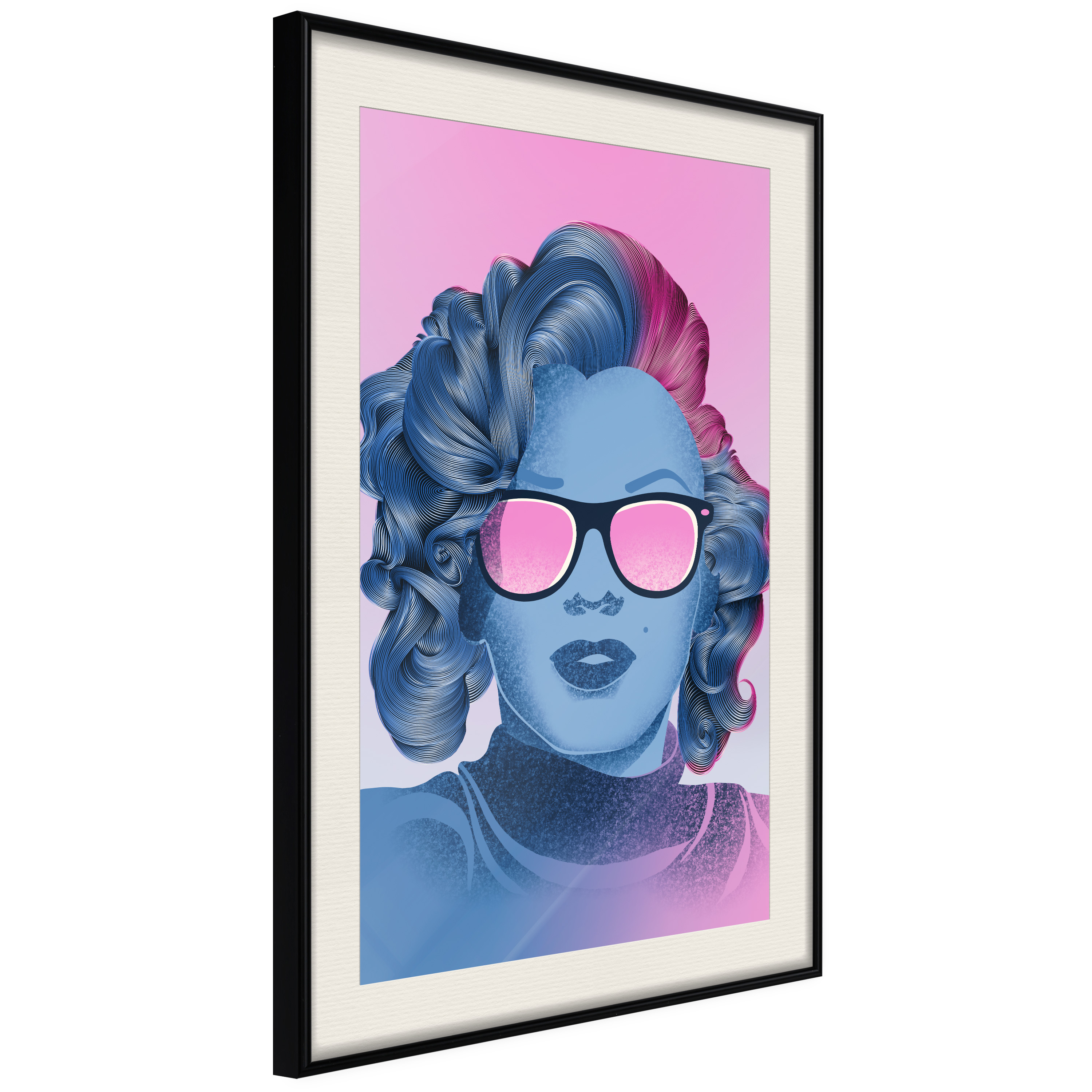 Passepartouten i écru betonar färgern på affischen och skapar en extra kontrast mellan grafiken, ramen och väggen. Dessutom ger den ramen ett svagt tredimensionellt intryck och fungerar även som ett skyddslager som ytterligare skyddar afischen. Affischen är säkrad med akrylglas och en hänganordning finns på ramens baksida.
