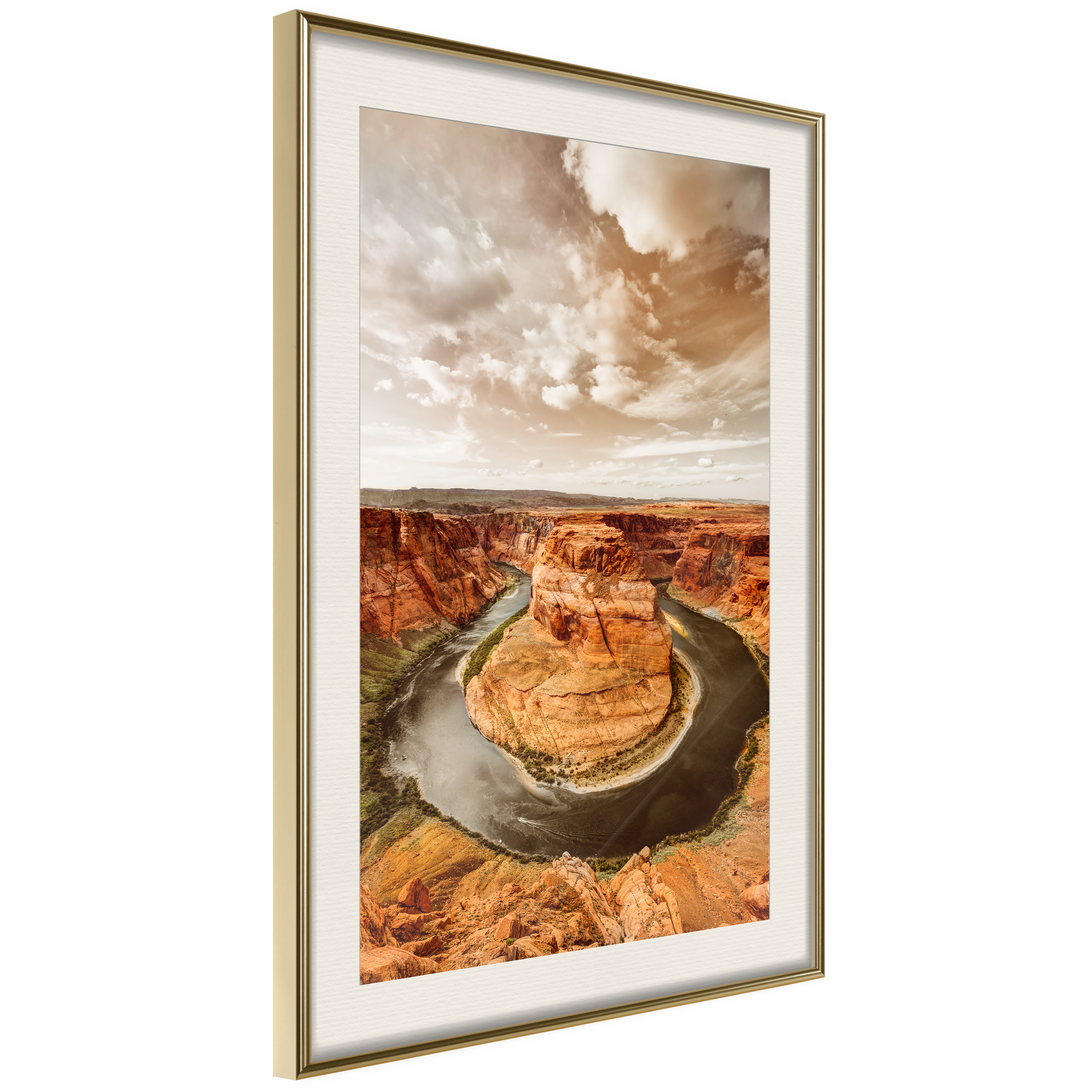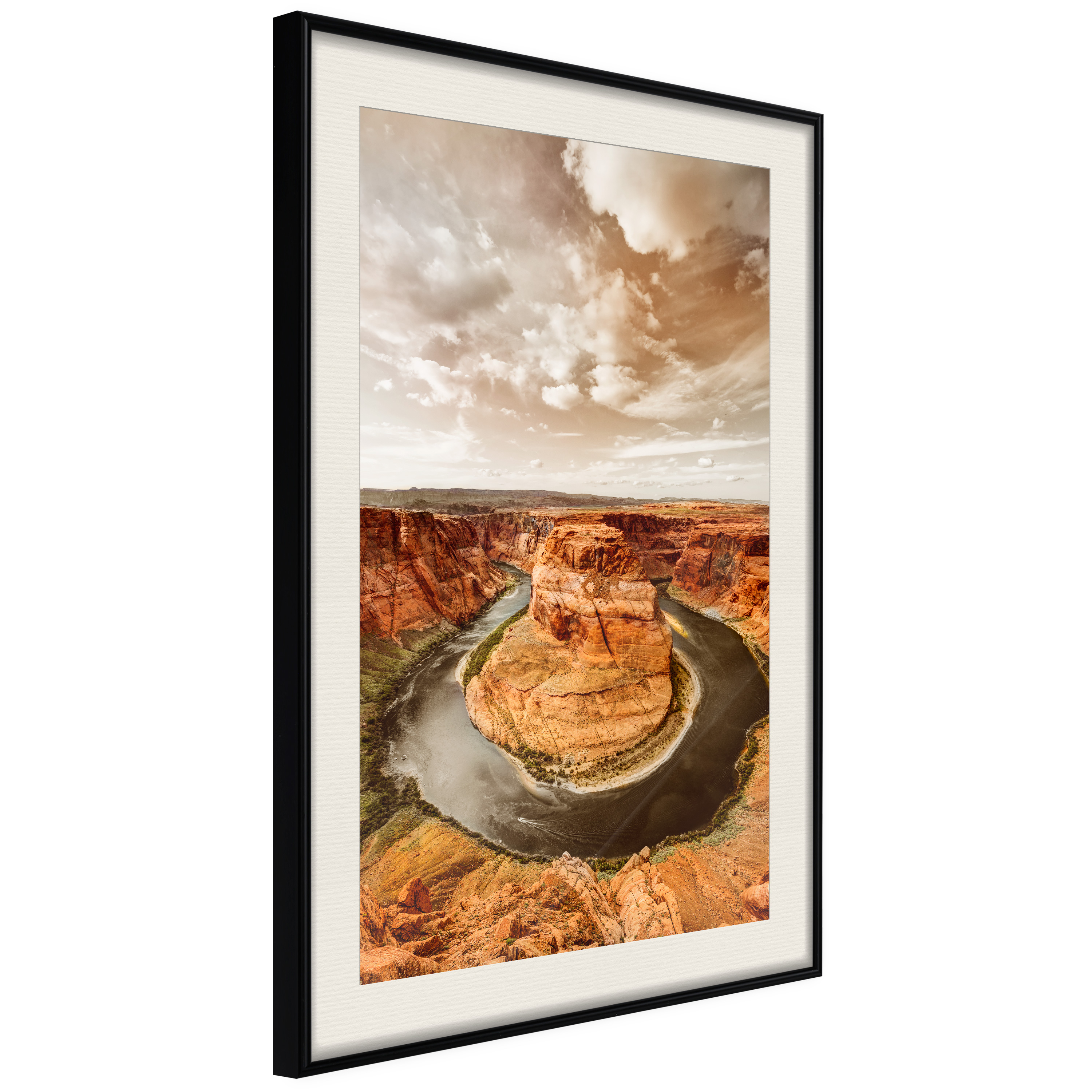 Passepartouten i écru betonar färgern på affischen och skapar en extra kontrast mellan grafiken, ramen och väggen. Dessutom ger den ramen ett svagt tredimensionellt intryck och fungerar även som ett skyddslager som ytterligare skyddar afischen. Affischen är säkrad med akrylglas och en hänganordning finns på ramens baksida.