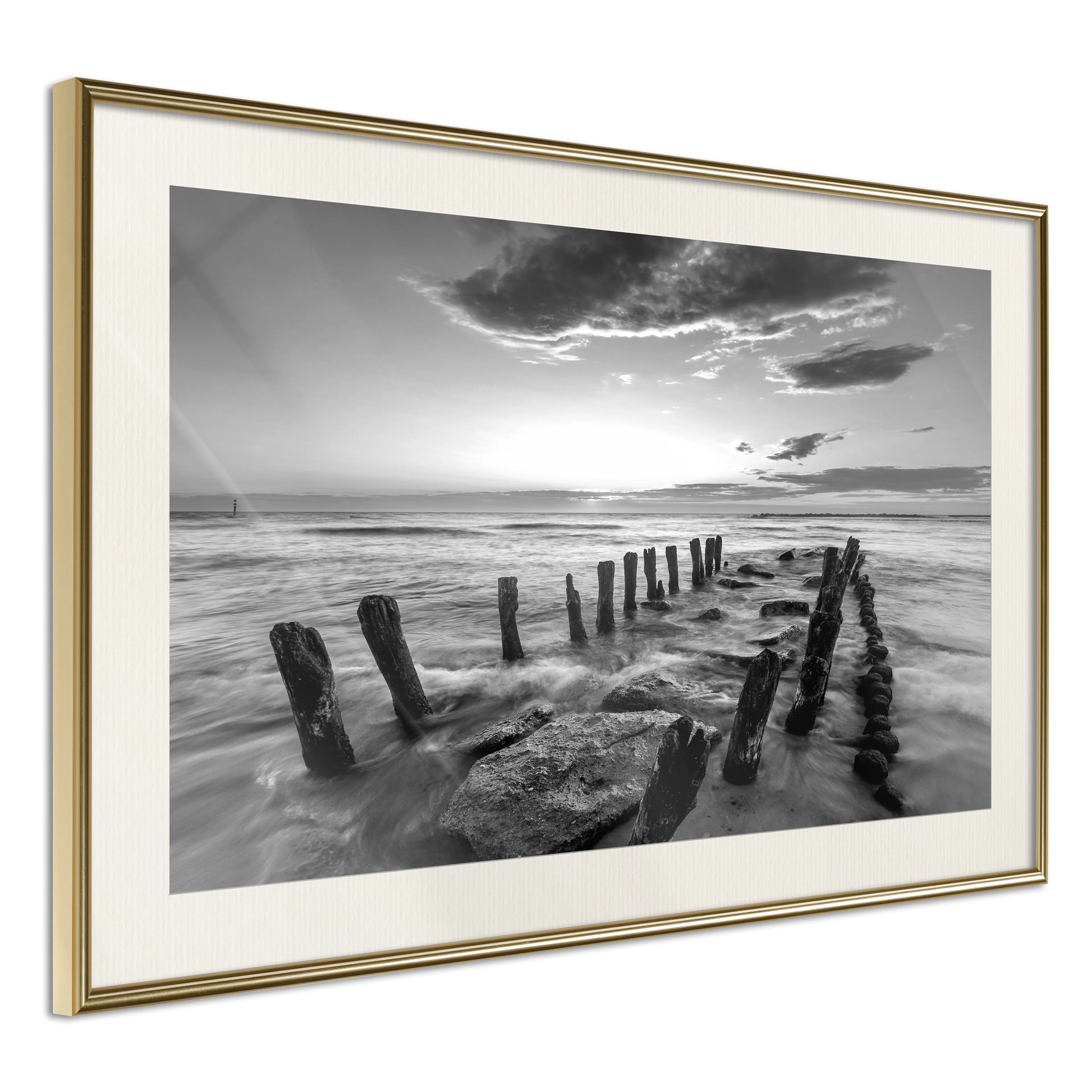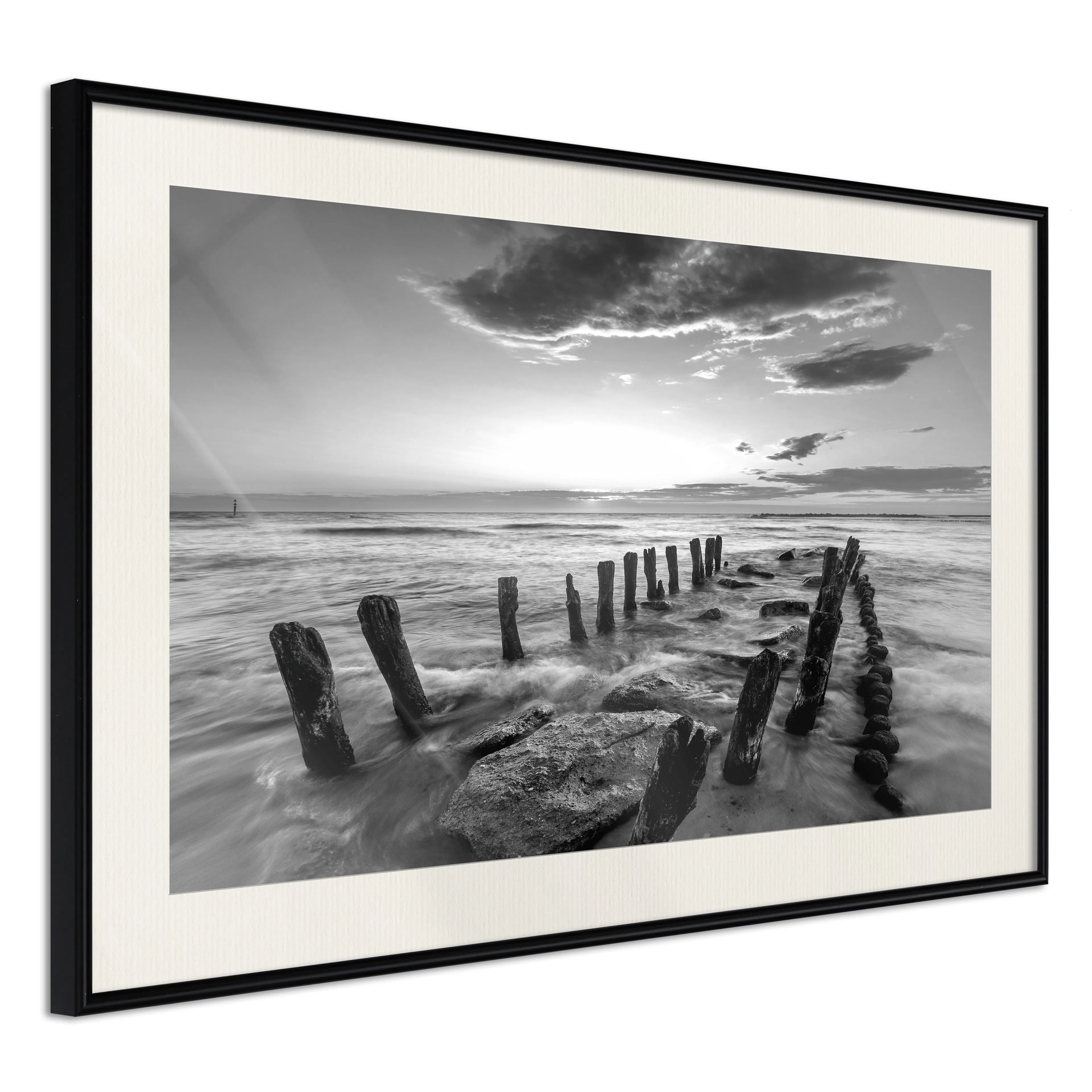 Passepartouten i écru betonar färgern på affischen och skapar en extra kontrast mellan grafiken, ramen och väggen. Dessutom ger den ramen ett svagt tredimensionellt intryck och fungerar även som ett skyddslager som ytterligare skyddar afischen. Affischen är säkrad med akrylglas och en hänganordning finns på ramens baksida.