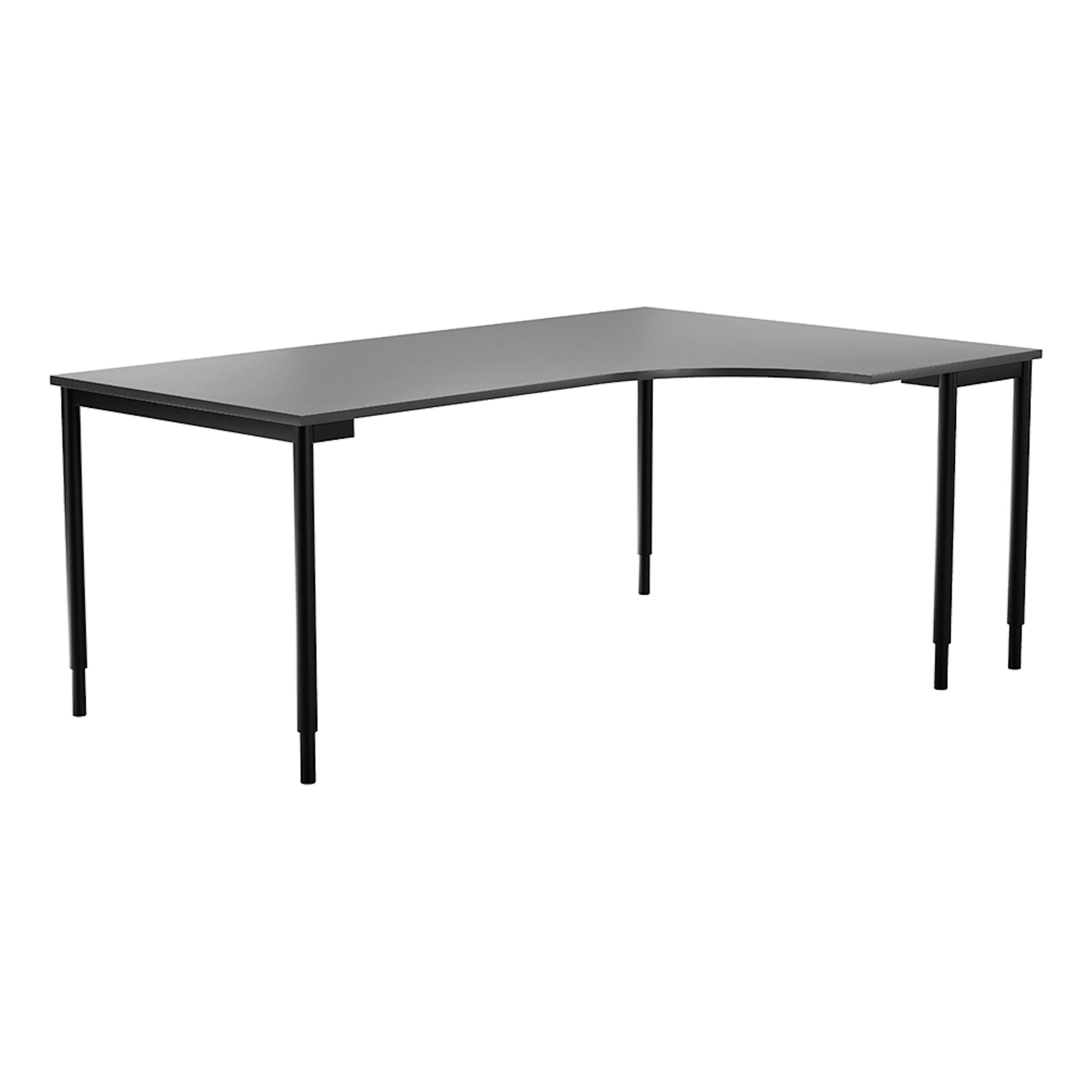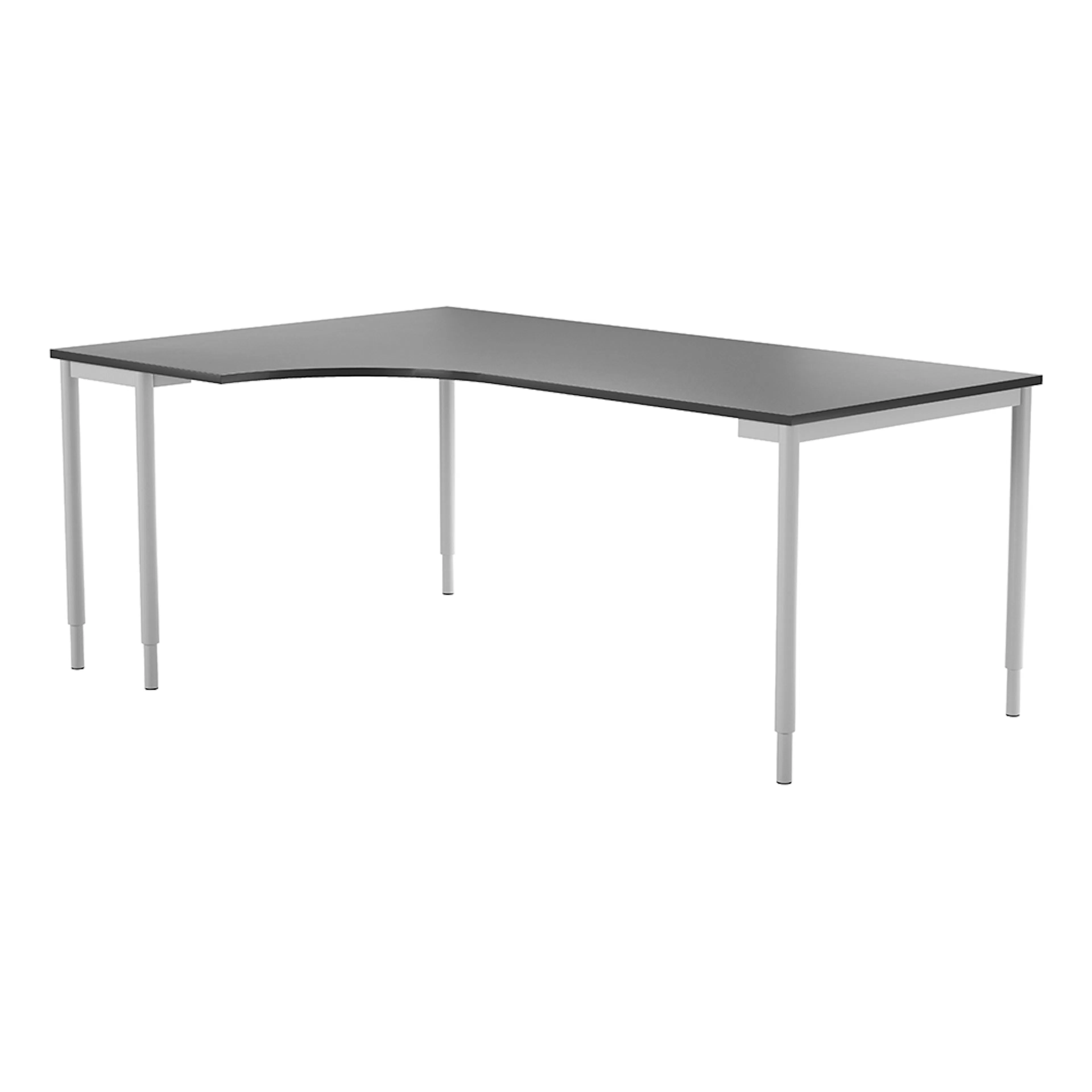 Hörnbord i klassisk design med svängd skiva och med fem raka ben som ger en stabil konstruktion. Bordshöjden kan ställas in manuellt så arbetshöjden kan justeras om det behövs. Med den svängda skivan passar bordet utmärkt in i ett hörn för att utnyttja ytorna på arbetsplatsen på bästa sätt. Bordet finns i flera utföranden så du kan välja mellan olika bordsskivor och stativfärger. Kombinera med någon av våra hurtsar som får plats under bordet om du vill ha en smidig och flexibel förvaring till din arbetsplats.