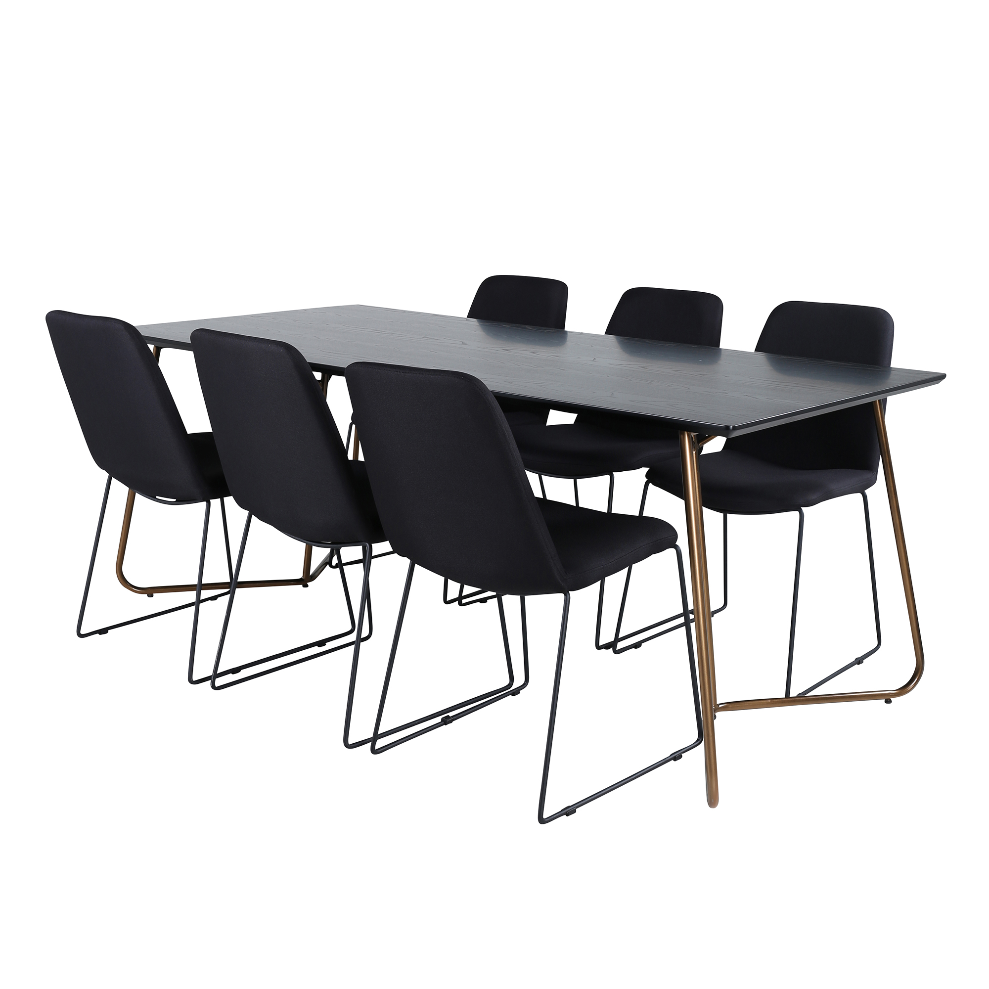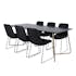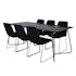 Matgrupp Annika från Venture Home. Med ett matbord i svart MDF med faner med svarta bordsben i järn. Matchas med 6 st Muscot matstolar med svarta stolsben i metall och svarta sitsar i polyester.