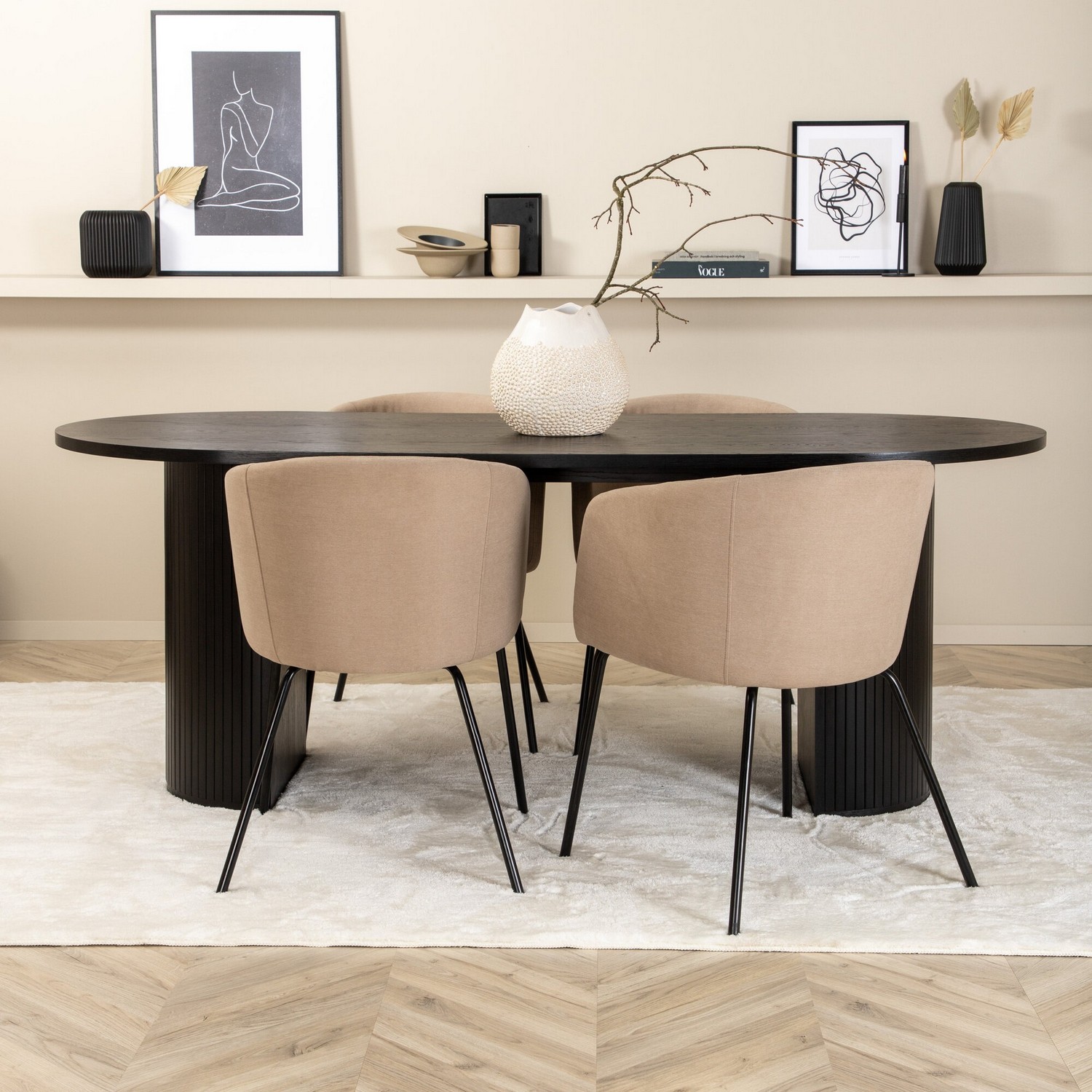 Matgrupp Bianca från Venture Home. Med ett ovalt matbord i MDF med faner med benvita samt svarta bordsben i trä och MDF. Matchas med 4 st Bergen matstolar med svarta stolsben i järn och beigea sitsar i polyester linne.