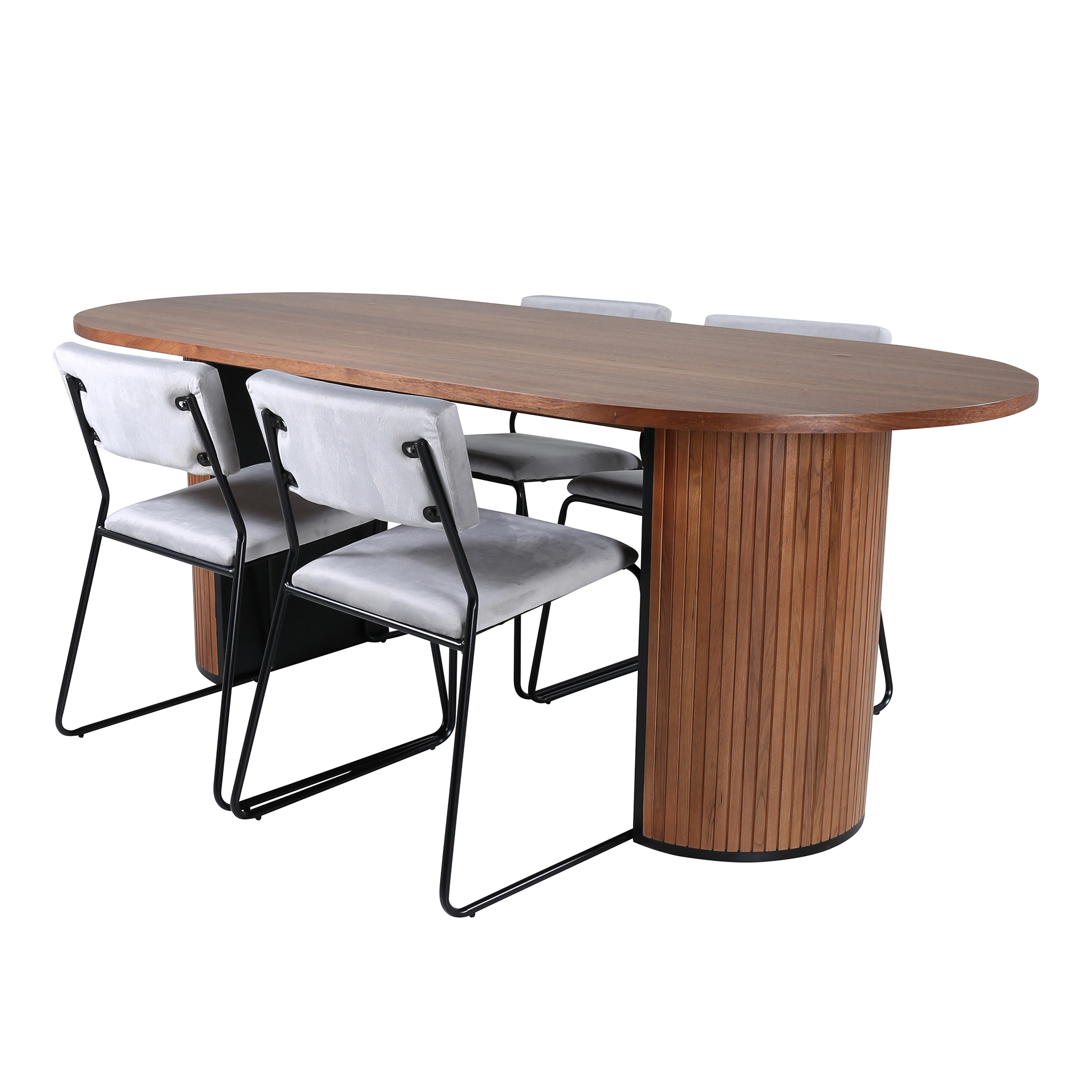 Matgrupp Bianca från Venture Home. Med ett ovalt matbord i valnötsfärgad MDF med faner med valnötsfärgade samt svarta bordsben i trä och MDF. Matchas med 4 st Kungshamn matstolar med svarta stolsben i järn och ljusgråa sitsar i sammet.