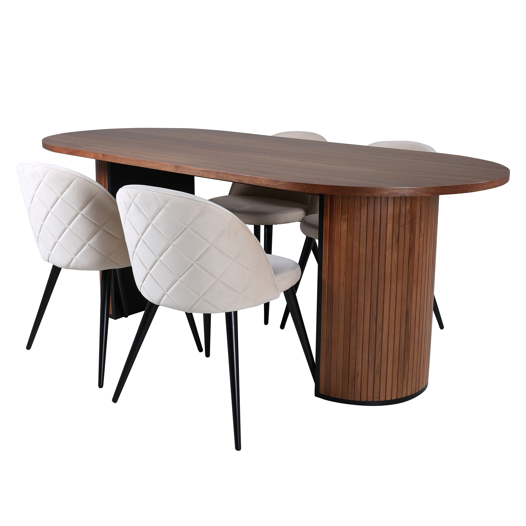 Matgrupp Bianca från Venture Home. Med ett ovalt matbord i MDF med faner med bordsben i trä och MDF. Matchas med 4 st Valentina stitcthes matstolar med dekorsöm och med svarta stolsben i järn och beigea sitsar i sammet.