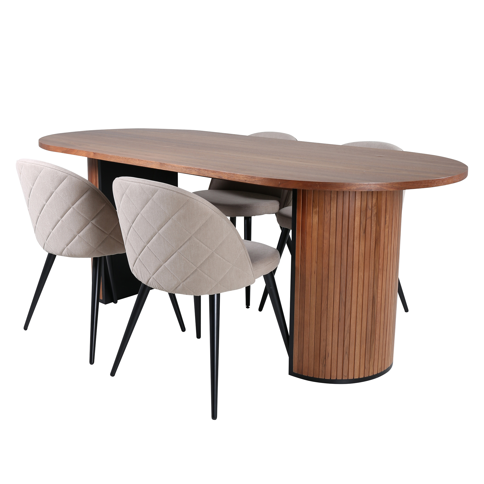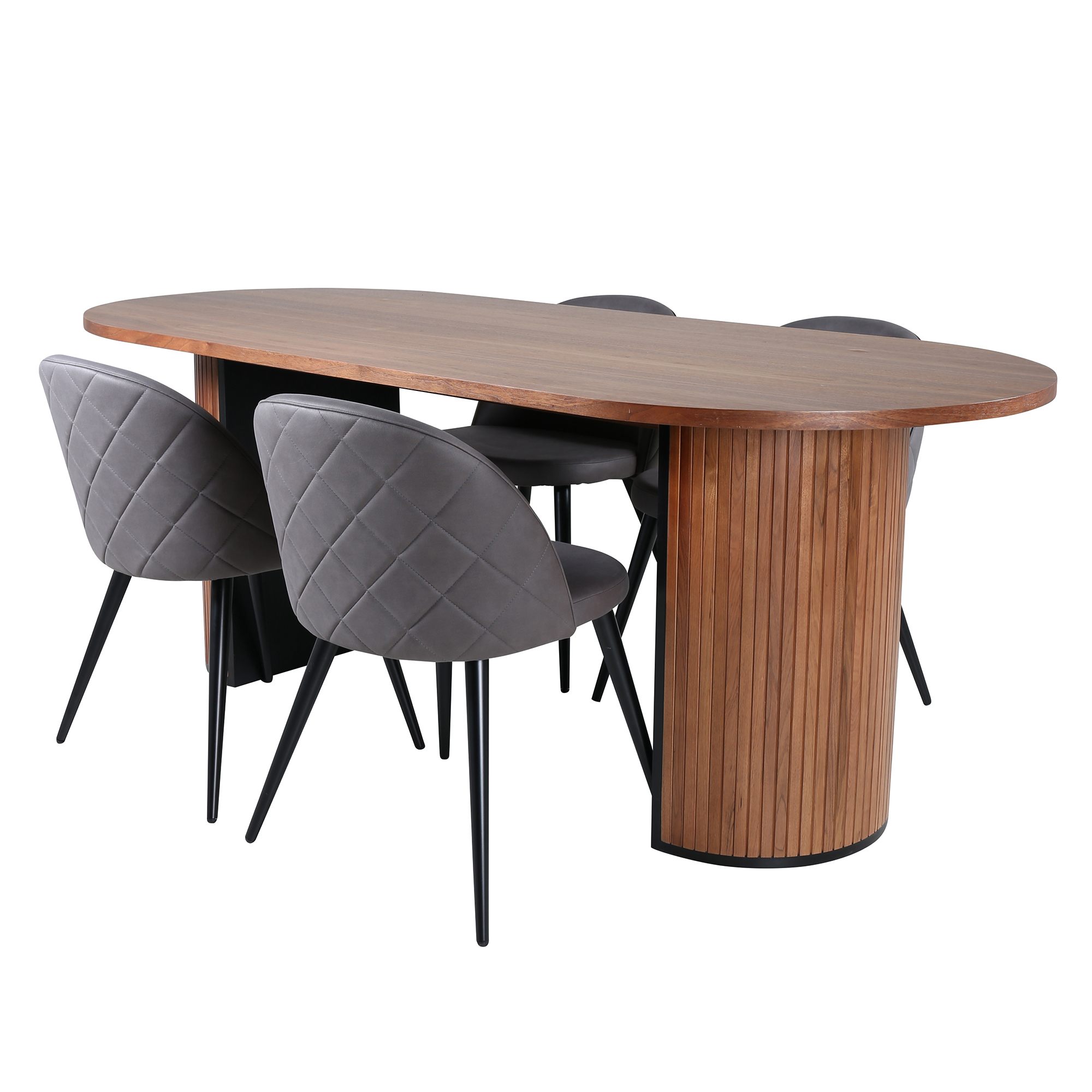 Matgrupp Bianca från Venture Home. Med ett ovalt matbord i valnötsfärgad MDF med faner med valnötsfärgade samt svarta bordsben i trä och MDF. Matchas med 4 st Valentina stitcthes matstolar med dekorsöm och med svarta stolsben i järn.