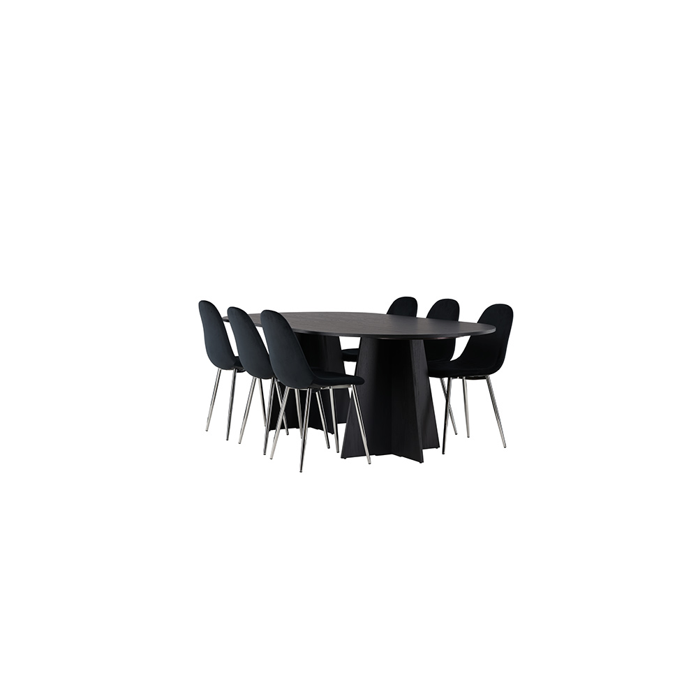 Vårt ovala matbord Bootcut fångar uppmärksamheten med sin unika design och eleganta kulörer. Den tunna bordsskivan i MDF med fanér skapar en minimalistisk känsla och bildar en harmonisk kontrast till de robusta och konformade benen. Varje detalj på detta bord utstrålar en exklusivitet som imponerar och inspirerar.