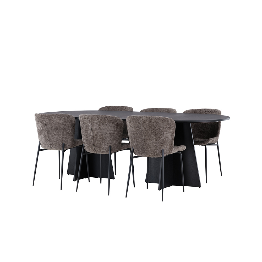 En genomtänkt matgrupp i trendsäker design! Vårt ovala matbord Bootcut har en unik design med en oval bordsskiva i MDF med faner och en säregen stomme med två konformade ben i öppen design. Här tillsammans med modemedvetna matstolar från serien Modesto. Stolen är helklädd i lurvigt tyg med stilrent smala stolsben i metall. Den lätt rundade ryggen och stoppade sittdynan ger extra komfort. Vad mer kan man önska?