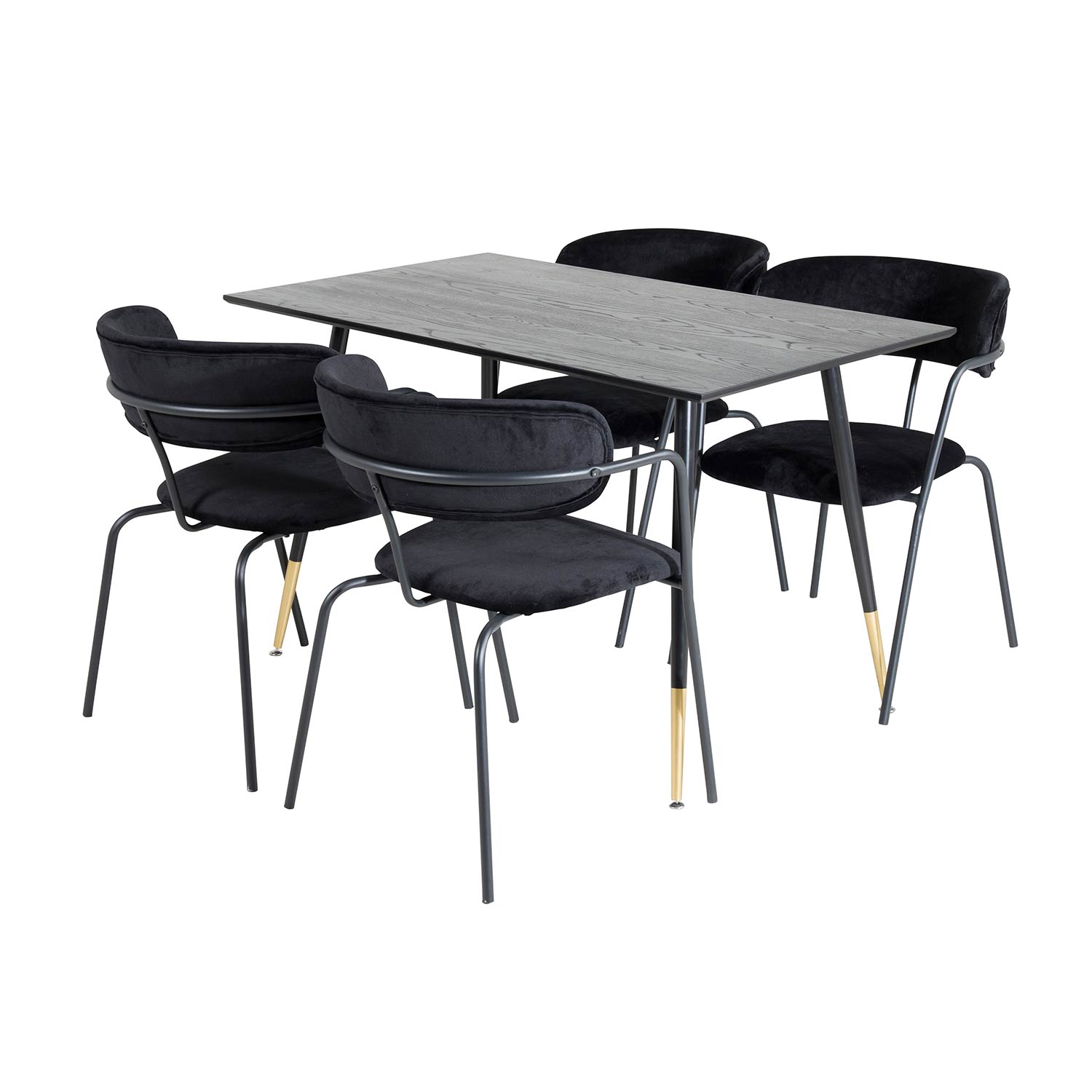 Matgrupp Dipp med 4 Arrow Stolar från Venture Home är en stilren matgrupp med ett rektangulärt matbord med en stomme och ben i svart pulverlackerad metall med benslut i mässingsfoliering samt med en bordsskiva i svart fanér med en kärna i MDF. Det medföljer fyra karmstolar med stomme, ben samt integrerade armstöd i metall. Rundad rygg och sits i stoppat sammetstyg. Lättare montering krävs.