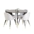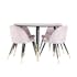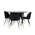 Rund matgrupp där både bord och stolar har häftiga sammanhängande detlajer i form av guldfärgade benslut. Matbord Dipp i svart tillsammans med matstolar Velvet i grått blir en vinnande kombination tillsammans med de tuffa gulddetaljerna.