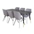 Matgrupp Dipp med 6 Gemma Stolar från Venture Home är en modern matgrupp med ett rektangulärt matbord med en stomme och ben i svart pulverlackerad metall samt med en bordsskiva i svart fanér med en kärna i MDF. Det medföljer sex matstolar i en helklädd exklusiv design med ben i svart pulverlackerad metall. stoppad rygg och sits i ett skålformat utförande i polyestertyg. Dekorsömmen på insidan av rygg och sits bildar ett snyggt rutmönster. Lättare montering krävs.