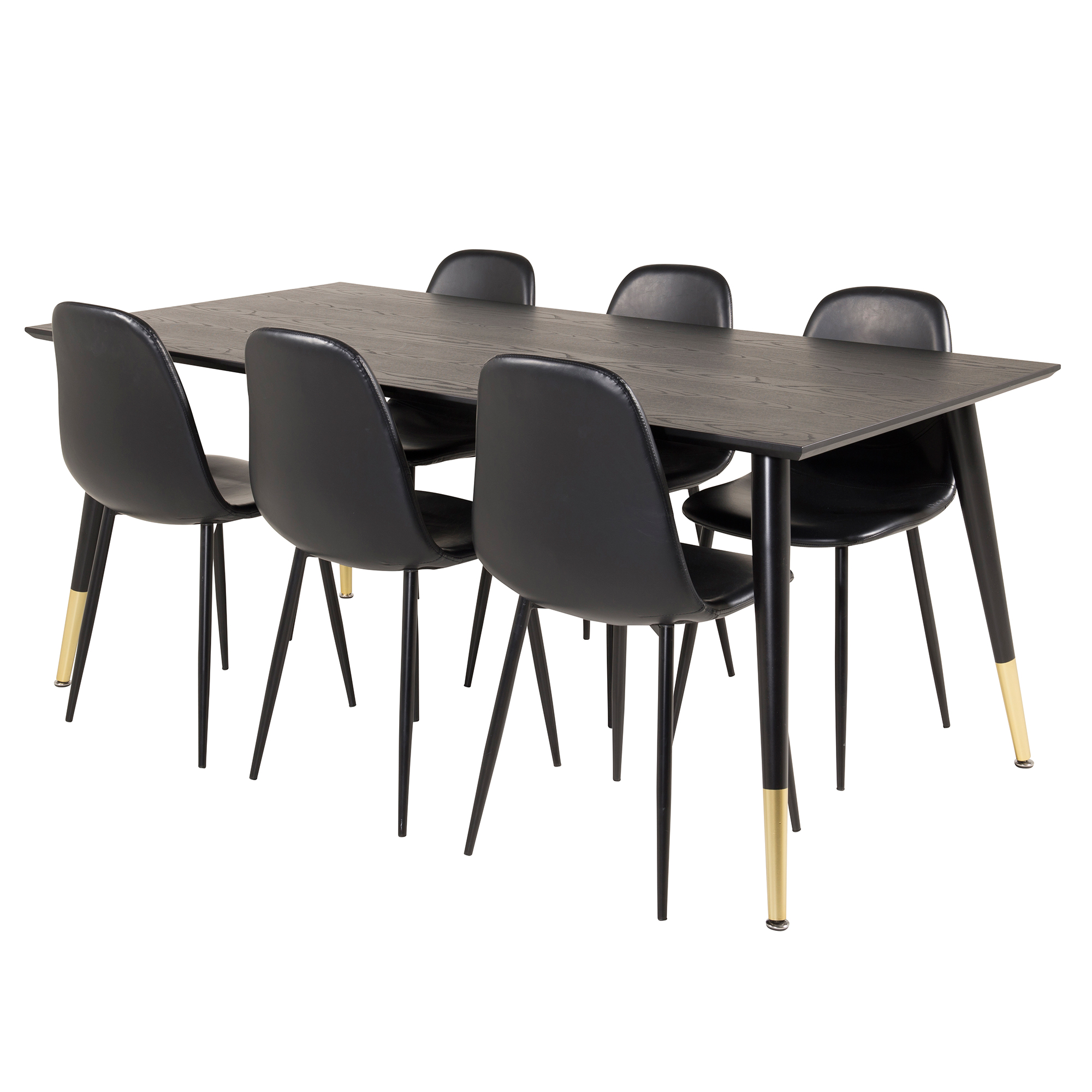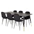 Matgrupp Venture Home DIpp med 6 Polar Stolar Polyestertyg är en modern matgrupp med ett rektangulärt matbord med en stomme och ben i svart pulverlackerad metall samt med en bordsskiva i svart fanér med en kärna i MDF. Det medföljer sex matstolar i en helklädd design med ben i svart pulverlackerad metall med en lätt rundad rygg och sits i polyestertyg. Lättare montering krävs.