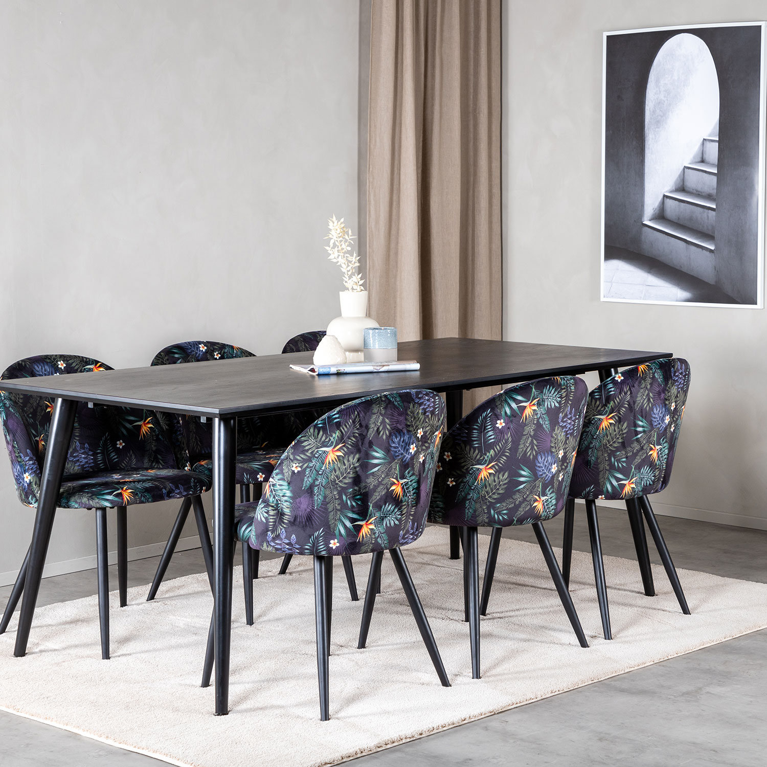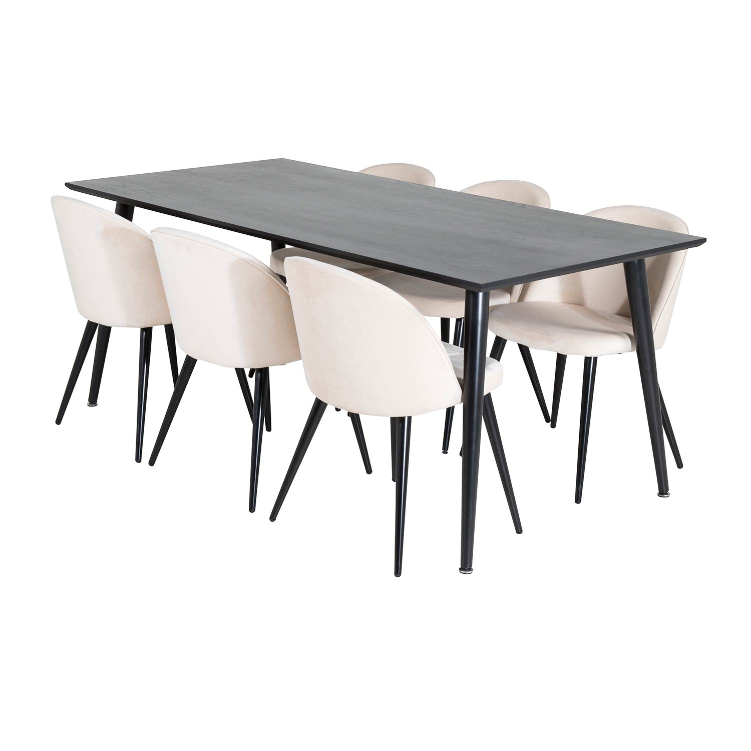 En snygg matgrupp från Venture Home bestående av Dipp matbord med sex stycken Velvet-stolar med svarta ben som har vackra detaljer.