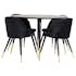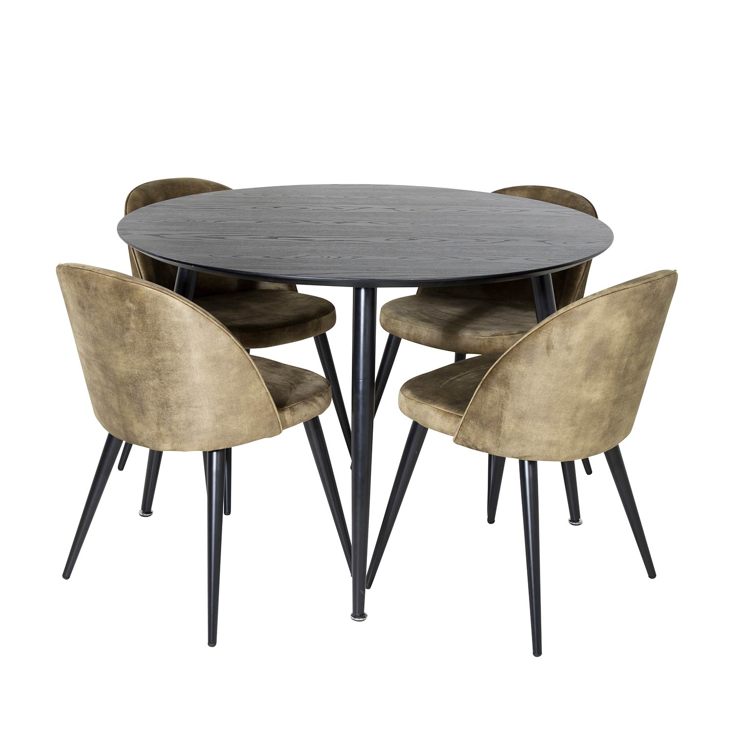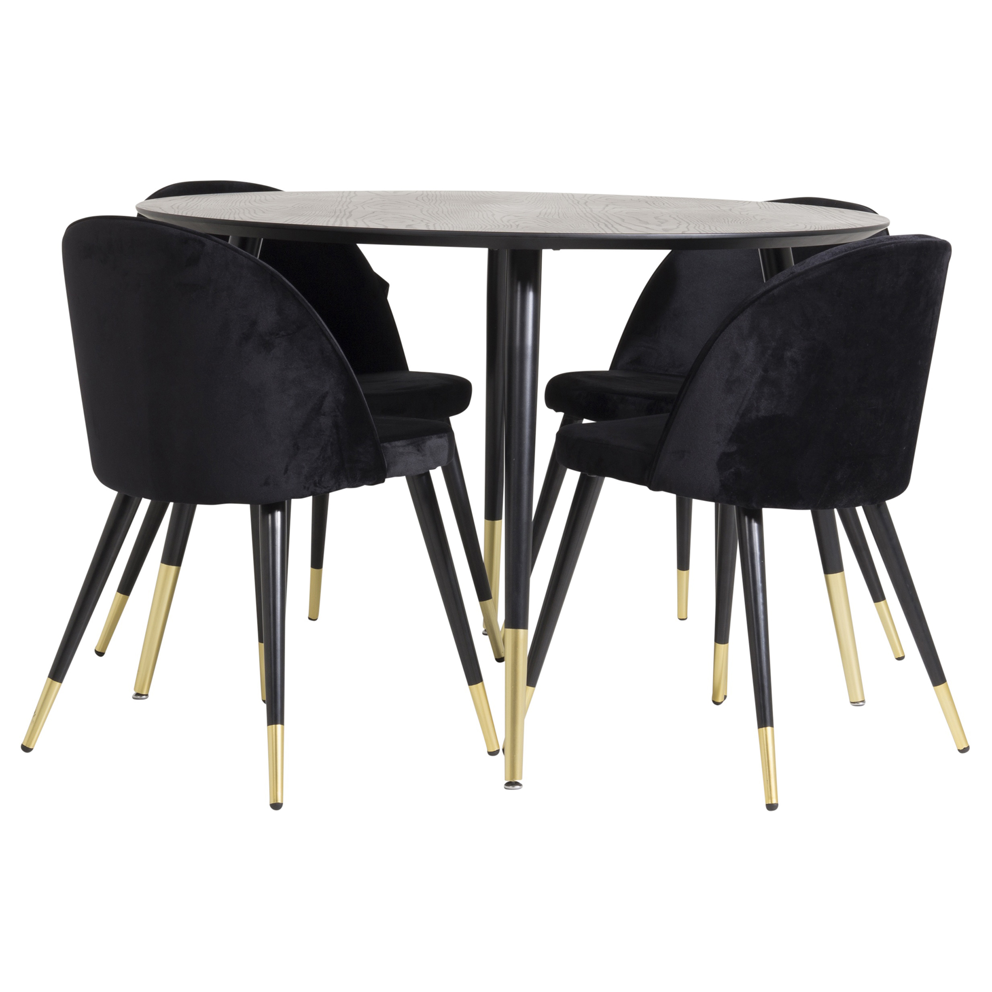 Matgrupp Dipp med Velvet stolar från Venture Home är en stilren matgrupp med ett svart runt matbord och fyra stycken stolar med svarta ben med vackra detaljer.