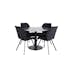 Matgrupp Estelle med 4 Geneva Stolar PolyEstelletyg från Venture Home är en stilren matgrupp med ett runt matbord i modern design med trumpetfot i pulverlackerad metall med en bordsskiva i marmor. Det medföljer fyra matstolar i en helklädd, exklusiv design med ben i svart pulverlackerad metall. Stolarna har en stoppad rygg och sits i ett skålformat utförande i polyEstelletyg. De har dessutom en dekorsöm på insidan av rygg och sits som bildar ett snyggt rutmönster. Lättare montering krävs.