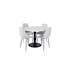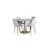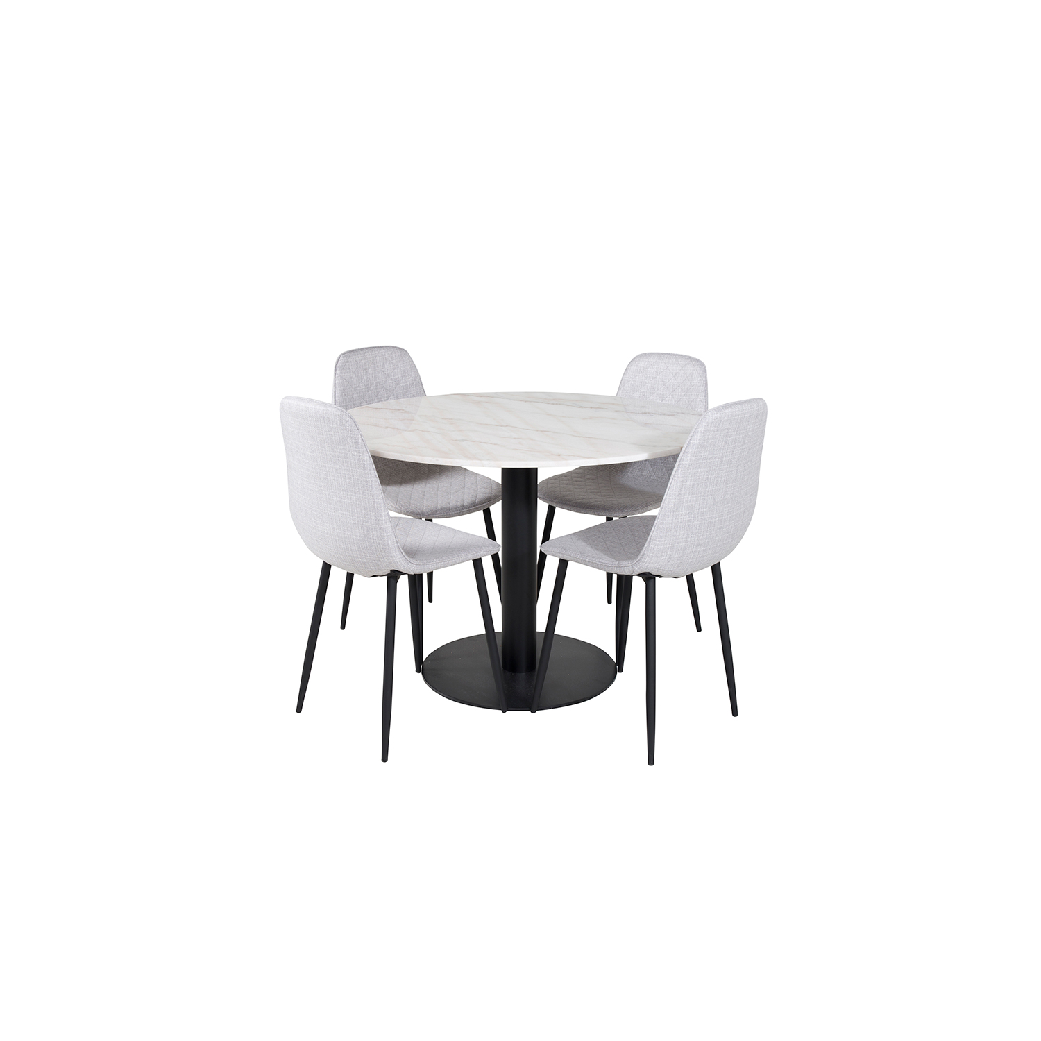 Matgrupp Estelle med 4 Phoi Stolar PolyEstelletyg från Venture Home är en stilren matgrupp med ett runt matbord i modern design med trumpetfot i pulverlackerad metall med en bordsskiva i marmor. Det medföljer fyra matstolar i en helklädd design med ben i pulverlackerad metall. Stolarna har en lätt rundad rygg och sits i stoppat polyEstelletyg med dekorsömmar på insidan av rygg och sits som bildar ett rutmönster. Lättare montering krävs.