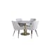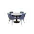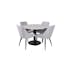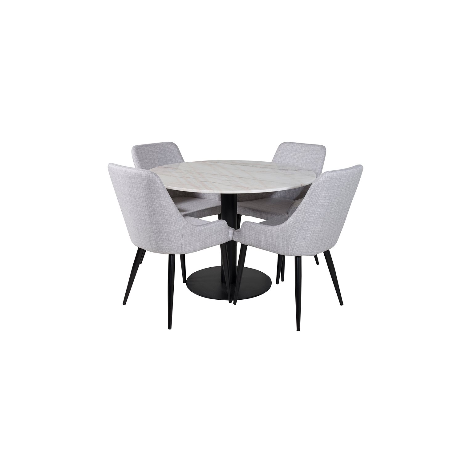Matgrupp Estelle med 4 Plake Fåtöljer PolyEstelletyg från Venture Home är en stilren matgrupp med ett runt matbord i modern design med trumpetfot i pulverlackerad metall med en bordsskiva i marmor. Det medföljer fyra fåtöljer/matstolar i en helklädd design med ben i pulverlackerad metall. Stolarna har en rygg och sits i polyEstelletyg med mjuk stoppning. Lättare montering krävs.