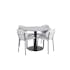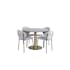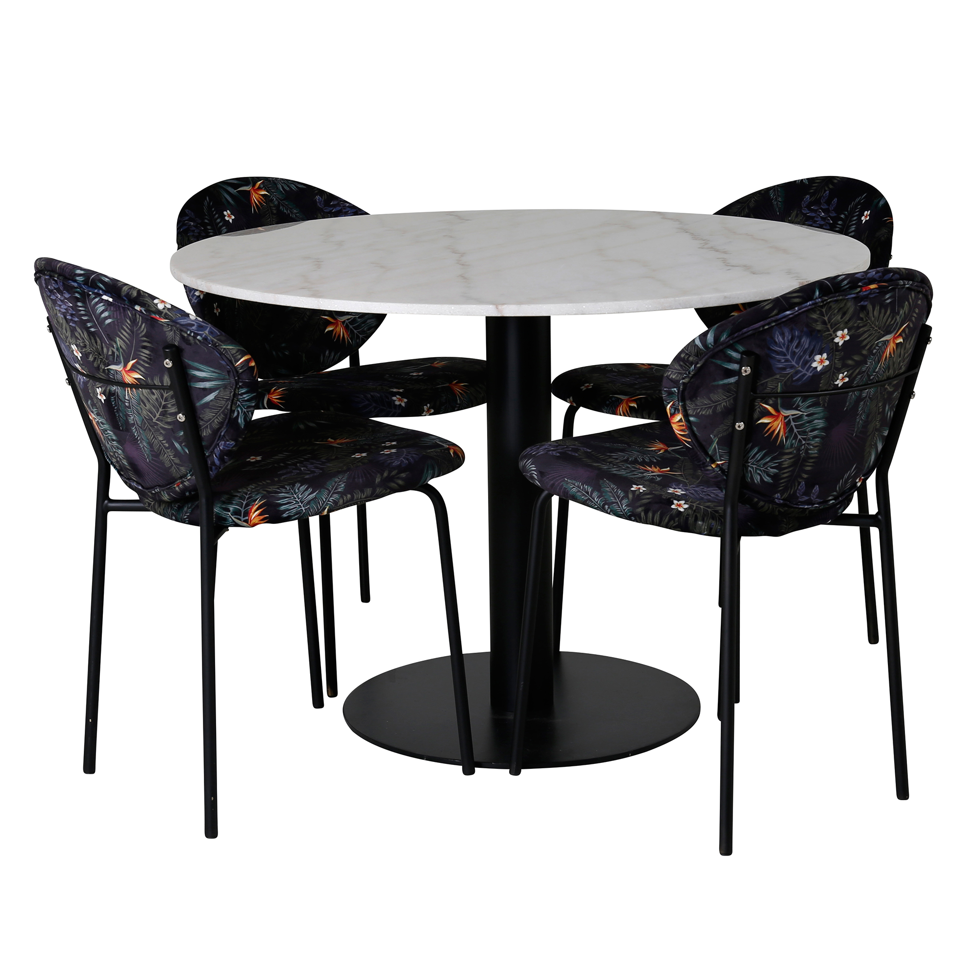 Matgrupp Estelle med 4 Valor Stolar PolyEstelletyg från Venture Home är en elegant matgrupp med ett runt matbord i modern design med trumpetfot i pulverlackerad metall med en bordsskiva i marmor. Det medföljer fyra matstolar med en stomme och ben i pulverlackerad metall i en snygg design med rund rygg. Stolarna har en rygg och sits i stoppat polyEstelletyg. Lättare montering krävs.