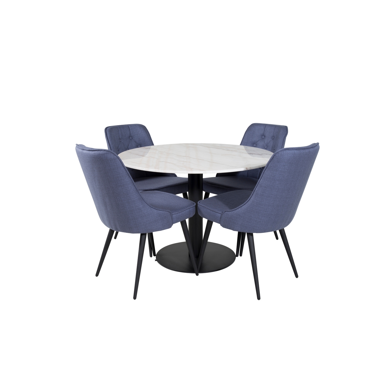 Matgrupp Estelle med 4 Vera Stolar PolyEstelletyg från Venture Home är en stilren matgrupp med ett runt matbord i modern design med trumpetfot i pulverlackerad metall med en bordsskiva i marmor. Det medföljer fyra matstolar i helklädd design med ben i svart pulverlackerad metall. Stolarna har en rygg med knappar och dekorsöm samt rygg och sits i polyEstelletyg med mjuk stoppning. Lättare montering krävs.