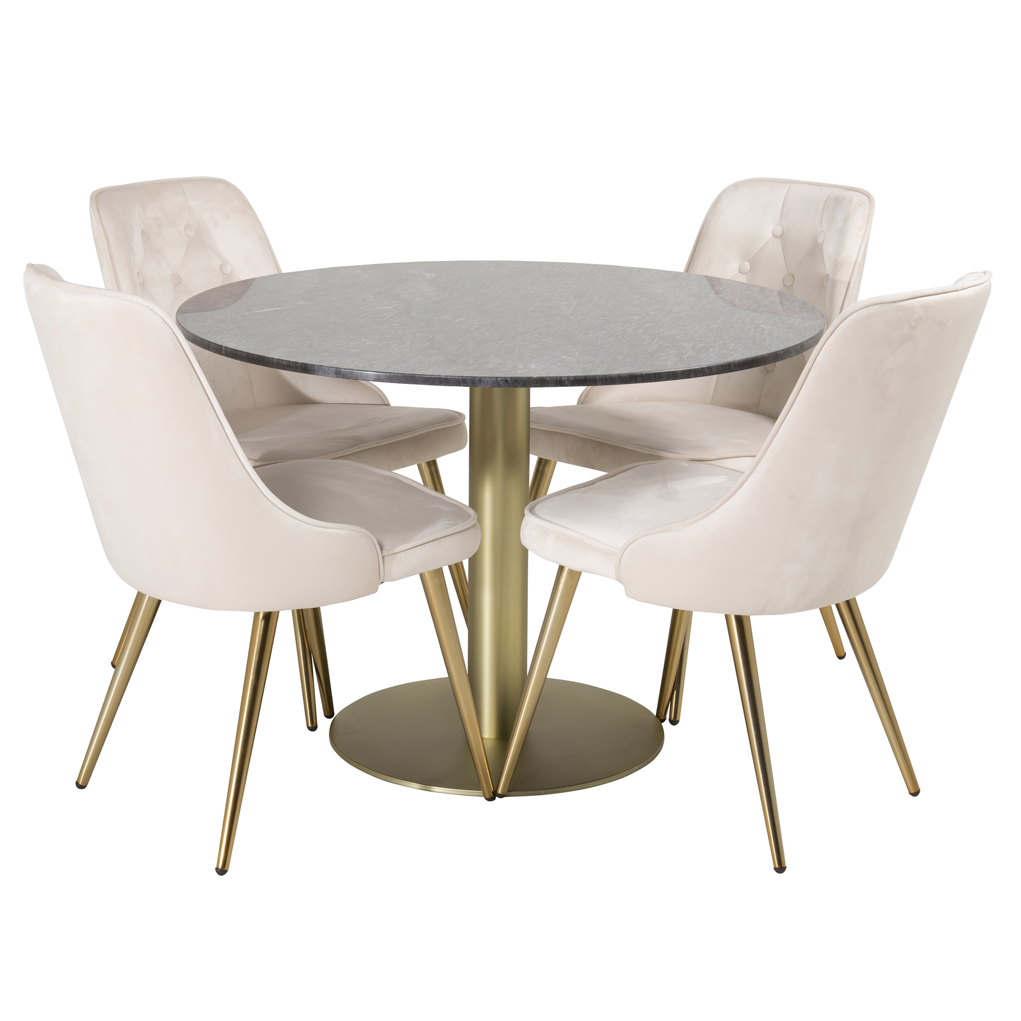 Matgrupp Estelle från Venture Home med ett runt matbord i svart marmor med mässingsfärgade bordsben i metall. Matchas med 4 st Vera matstolar med stolsits i sammet och stolsben i metall.