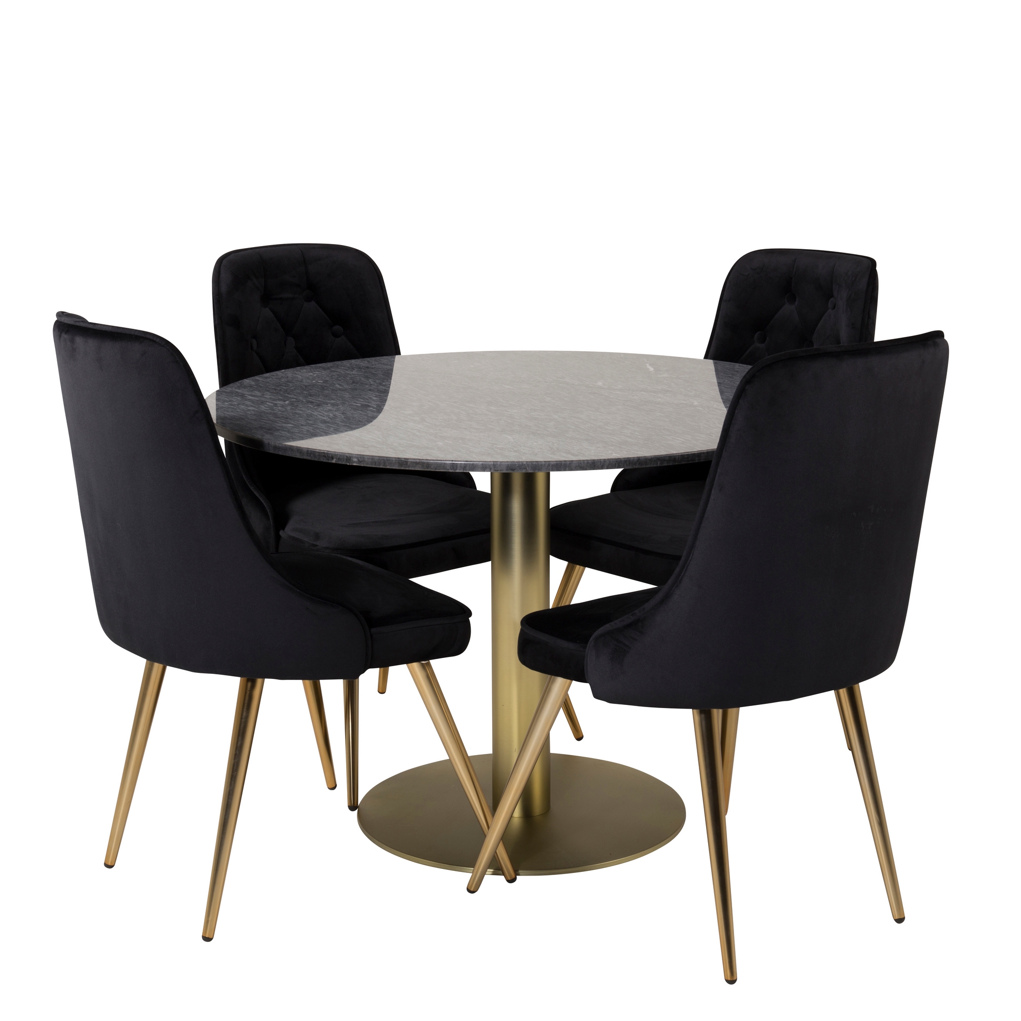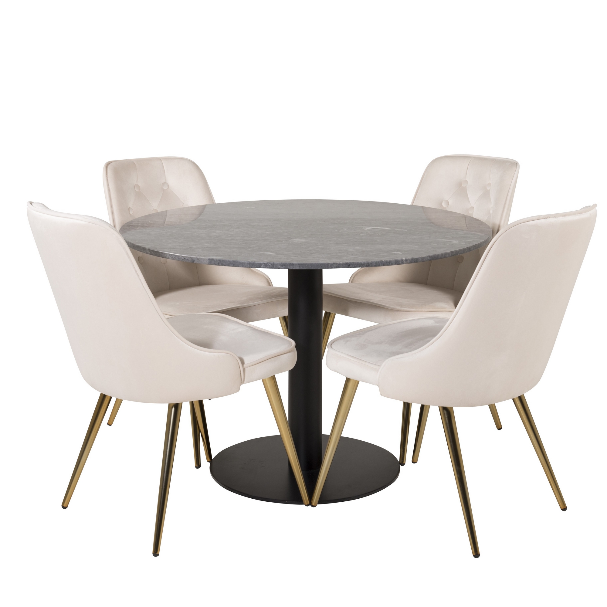Matgrupp Estelle Rund med 4 Vera Stolar Sammet från Venture Home är en modern matgrupp med ett marmorbord och fyra stolar i sammet.