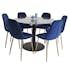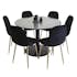 Matgrupp Estelle från Venture Home med ett runt matbord i svart marmor med svarta bordsben i metall. Matchas med 6 st Pobbie matstolar med stolsits i sammet och mässingsfärgade stolsben i metall.
