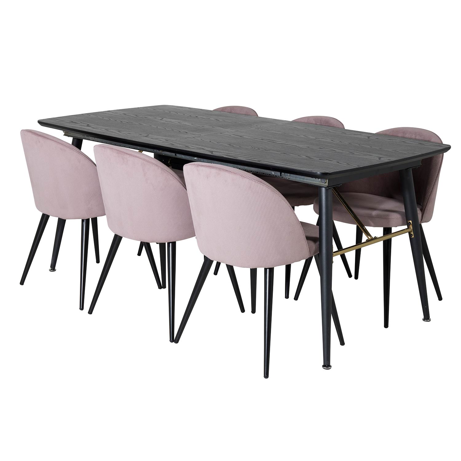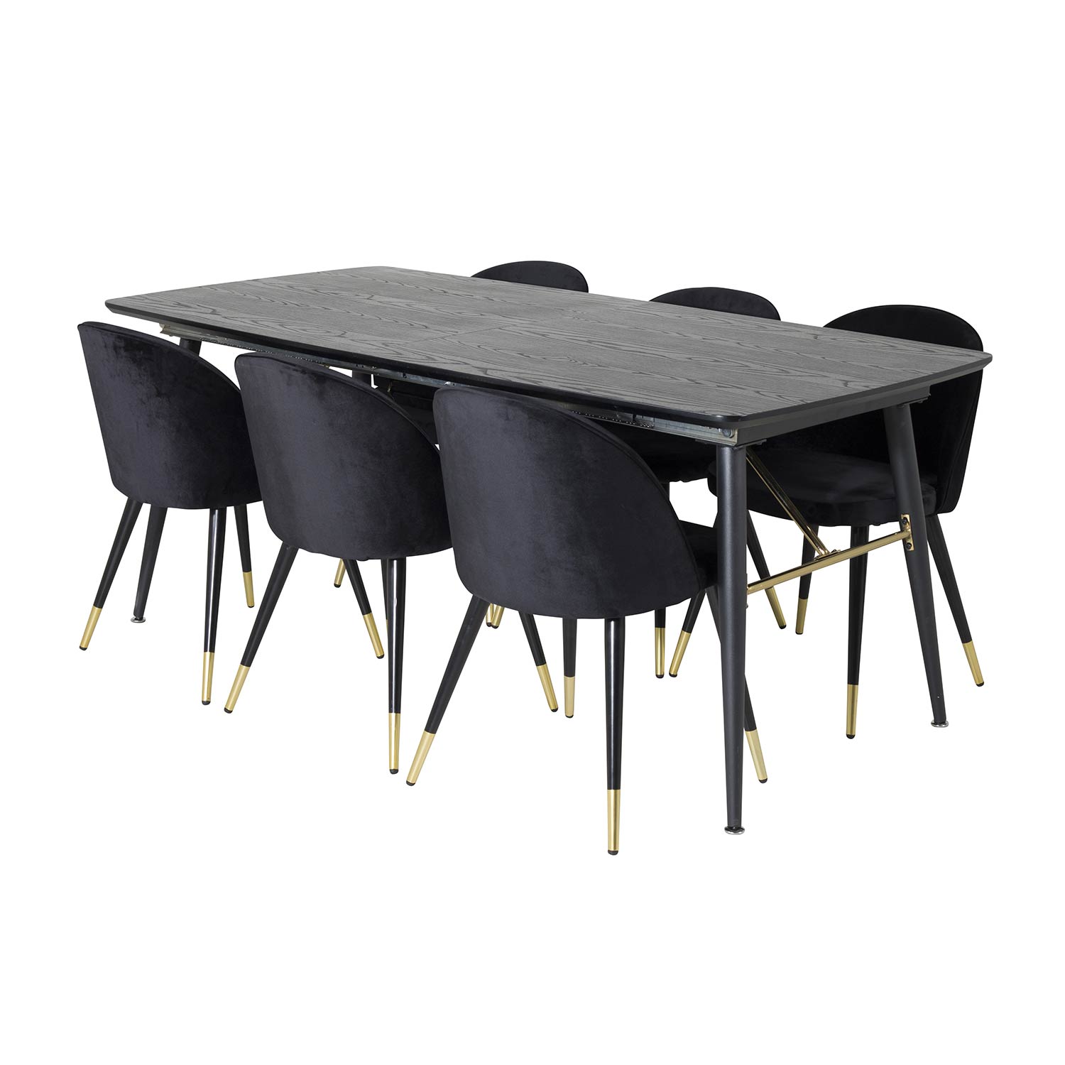Matgrupp Venture Home Guld med 6 Velvet Stolar Sammet är en elegant matgrupp med ett förlängningsbart matbord i svart MDF och svarta bordsben i metall. Det medföljer sex matstolar med svarta stolsben i metall och sitsar i sammet.