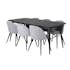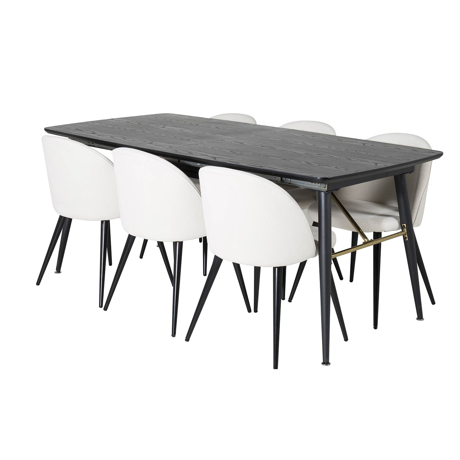 Matgrupp Guld med 6 Valentina Stolar Manchester från Venture Home är en stilren matgrupp med ett förlängningsbart matbord i svart MDF och svarta bordsben i metall. Det medföljer sex matstolar med svarta stolsben i metall och sitsar i manchester.