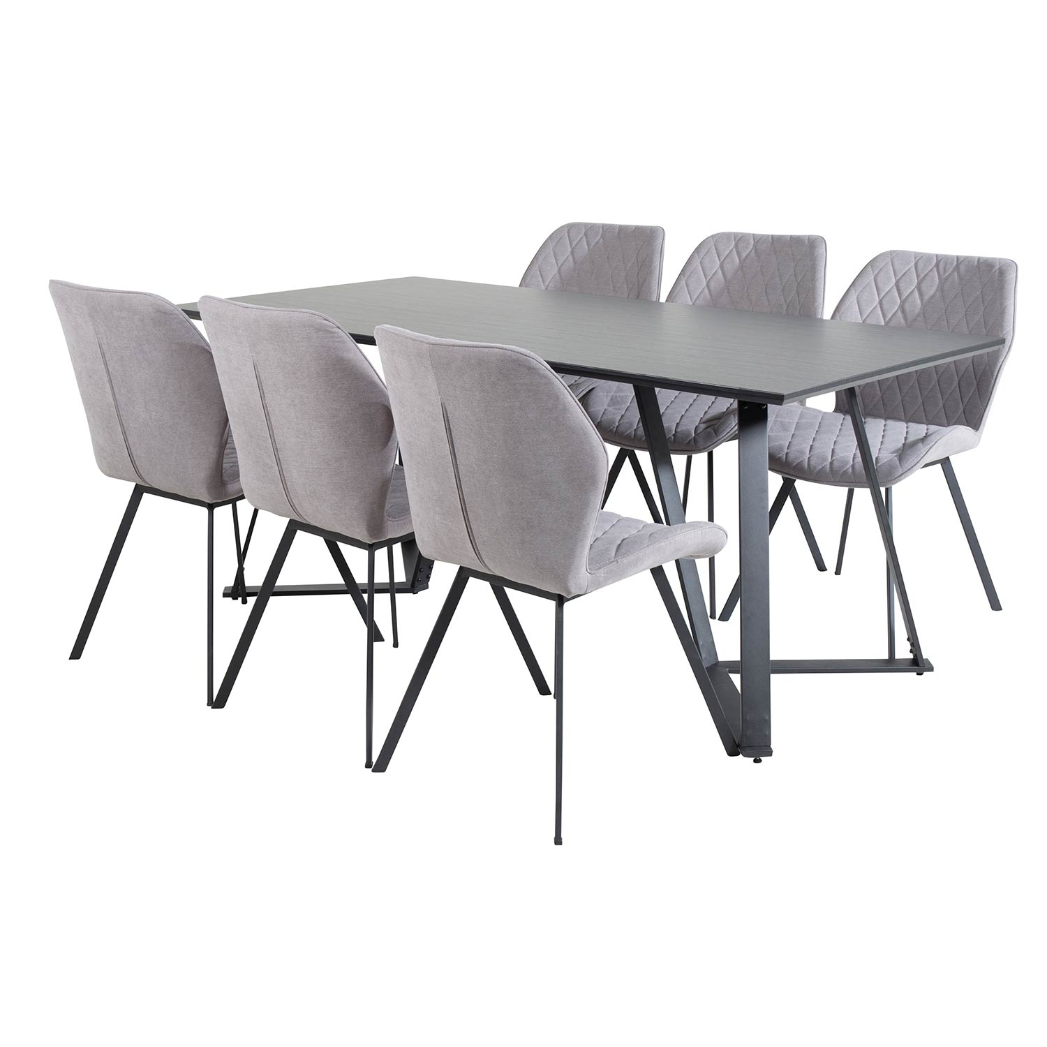 Matgrupp Madde med 6 Geneva Stolar från Venture Home är en modern matgrupp med ett matbord i MDF med svarta bordsben i metall. Det medföljer sex matstolar med svarta stolsben i metall och sitsar i polyester.
