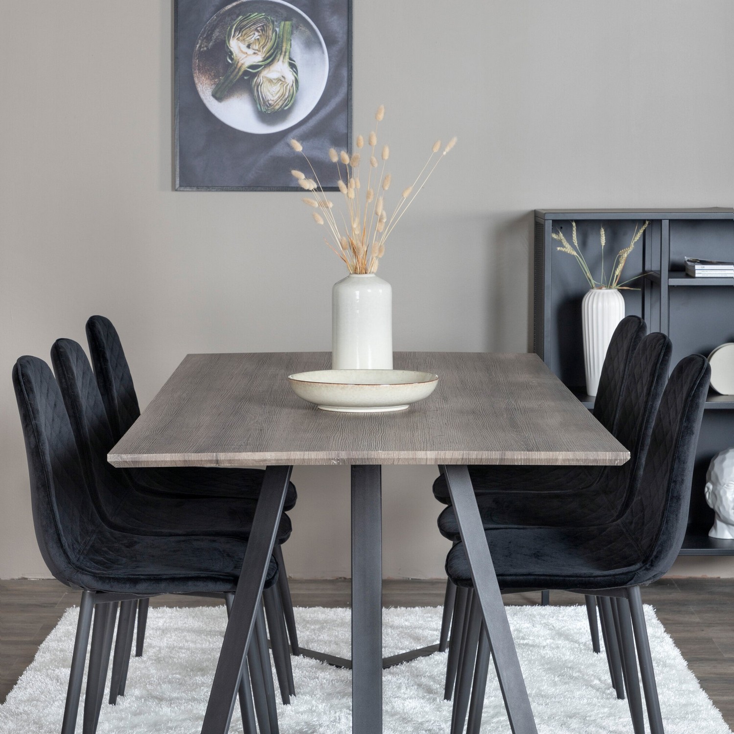 Matgrupp Madde med 6 Phoi Stolar Sammet från Venture Home är en modern matgrupp med ett matbord i MDF med svarta bordsben i metall. Det medföljer sex matstolar med svarta stolsben i metall och sitsar i sammet.