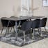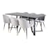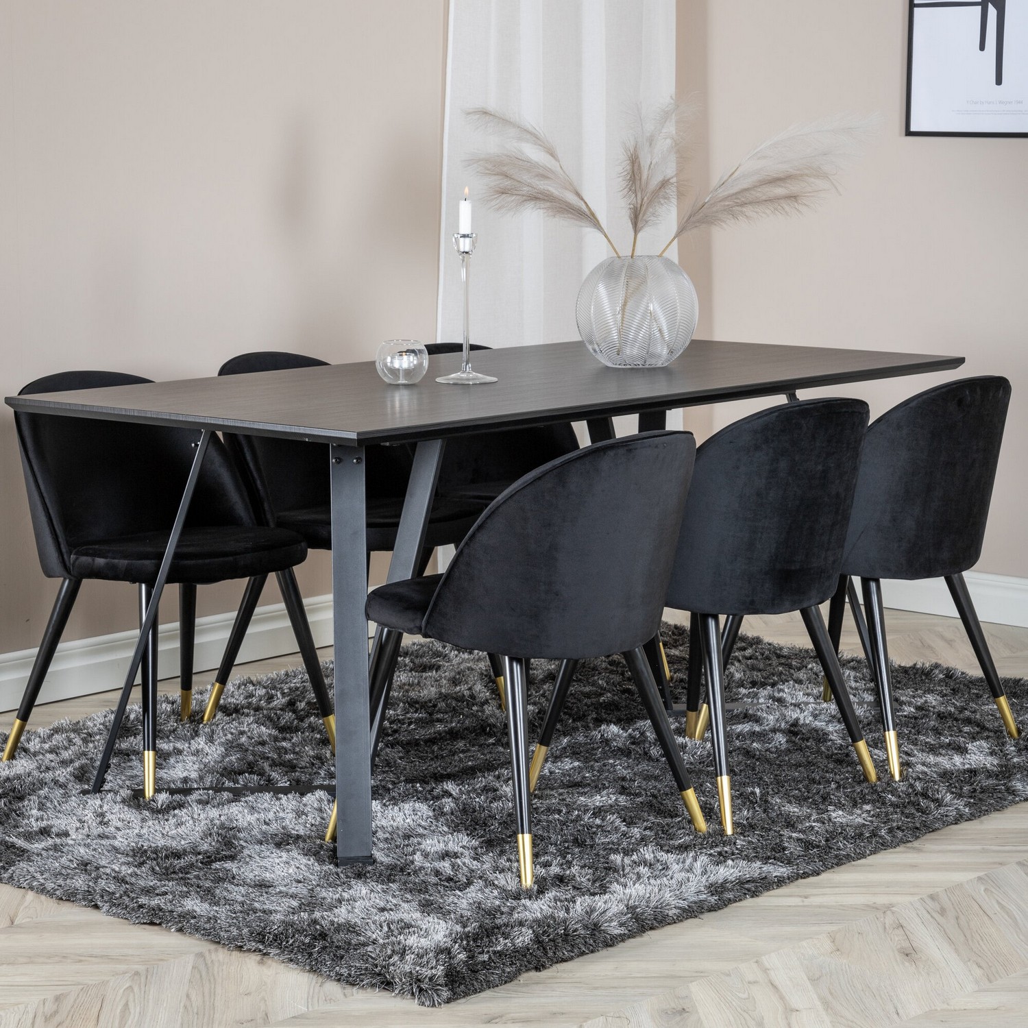 Matgrupp Madde med 6 Valentina Stolar Sammmet från Venture Home är en modern matgrupp med ett matbord i MDF med svarta bordsben i metall. Det medföljer sex matstolar med svarta stolsben i metall och sitsar i sammet.