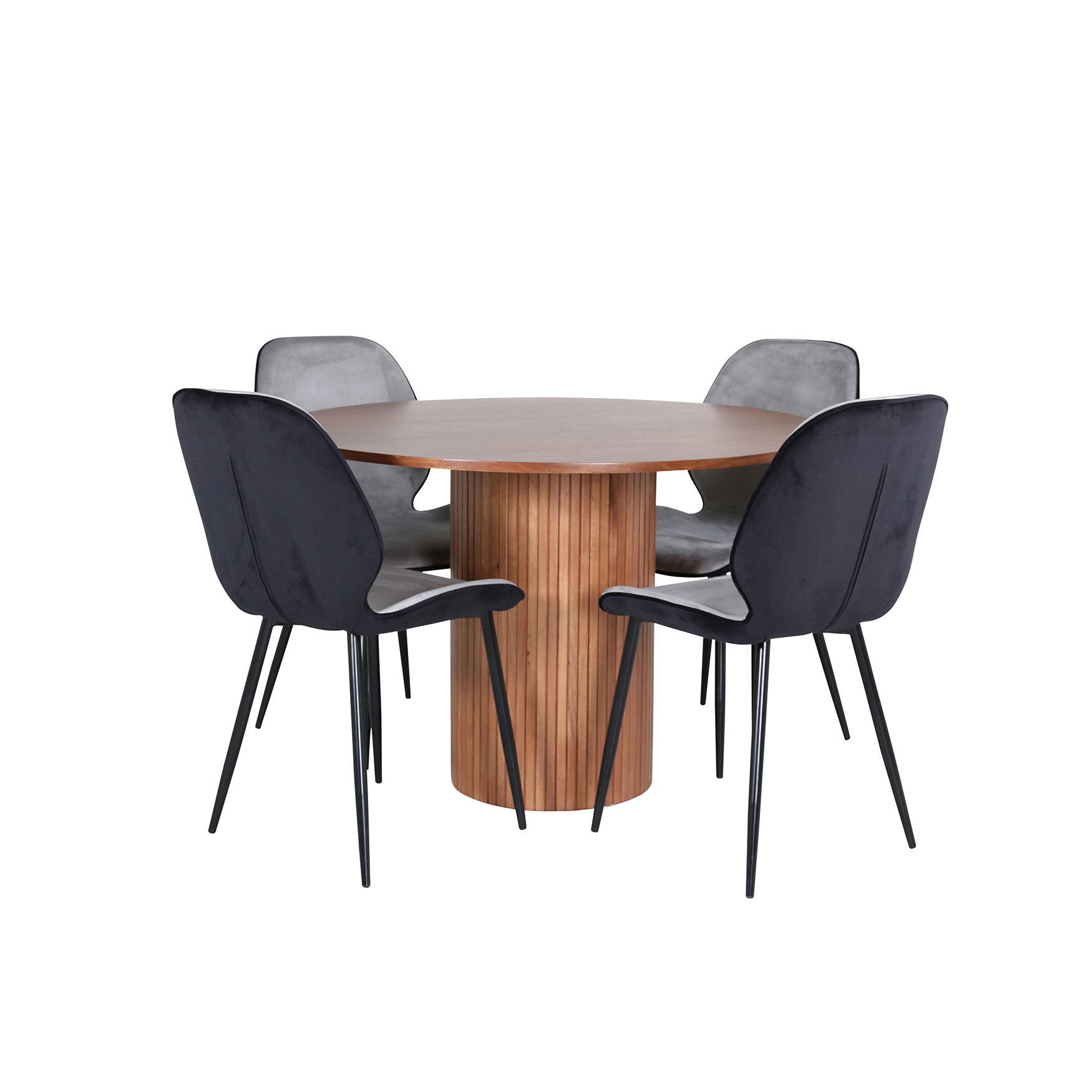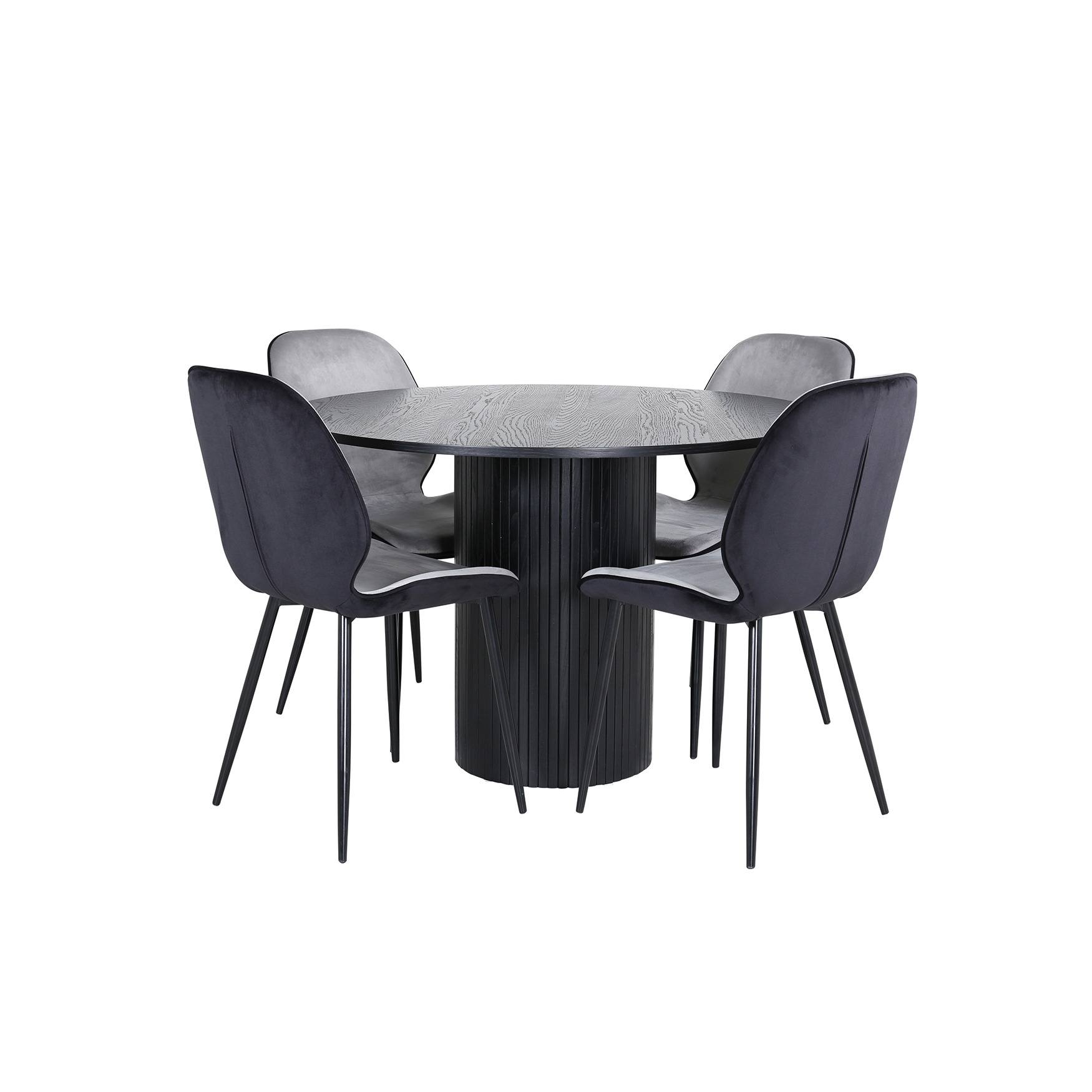 Matgrupp Bianca, med ett runt matbord i benvit MDF med faner med bordsben i trä och MDF. Matchas med 4 st Elisa matstolar med sitsar i sammet.