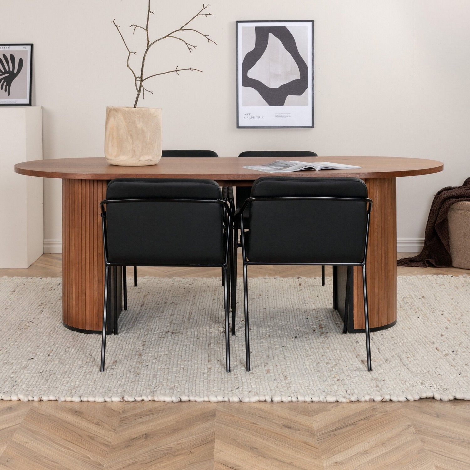 Matgrupp Bianca, med ett ovalt matbord i MDF med faner med bordsben i trä och MDF. Matchas med 4 st Tjärö matstolar med sitsar i konstläder.