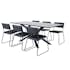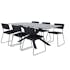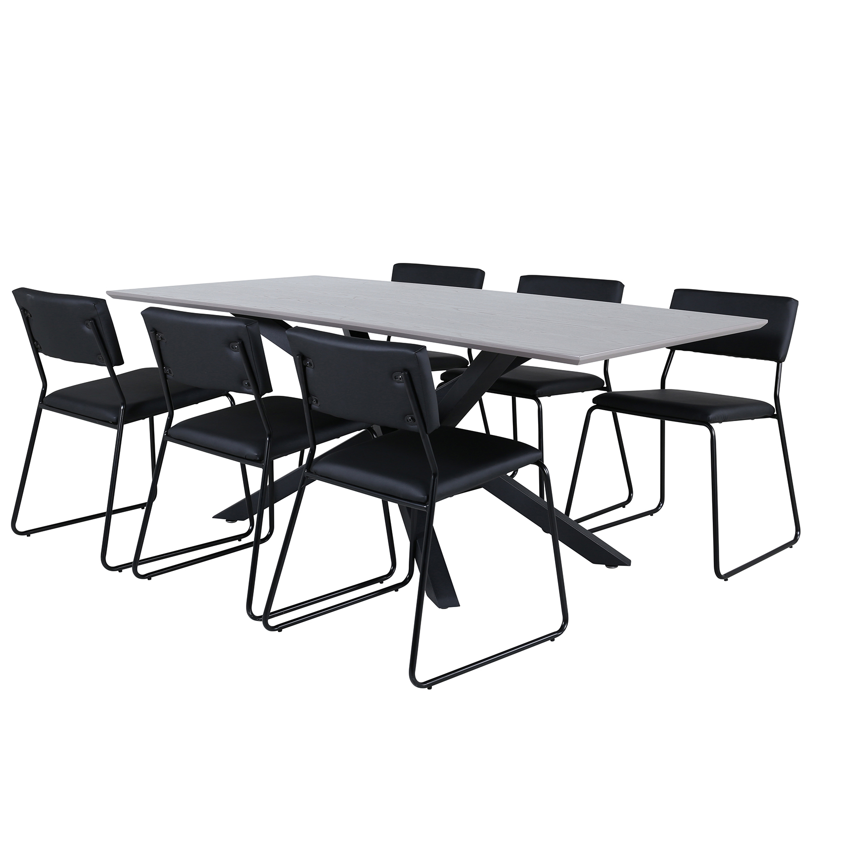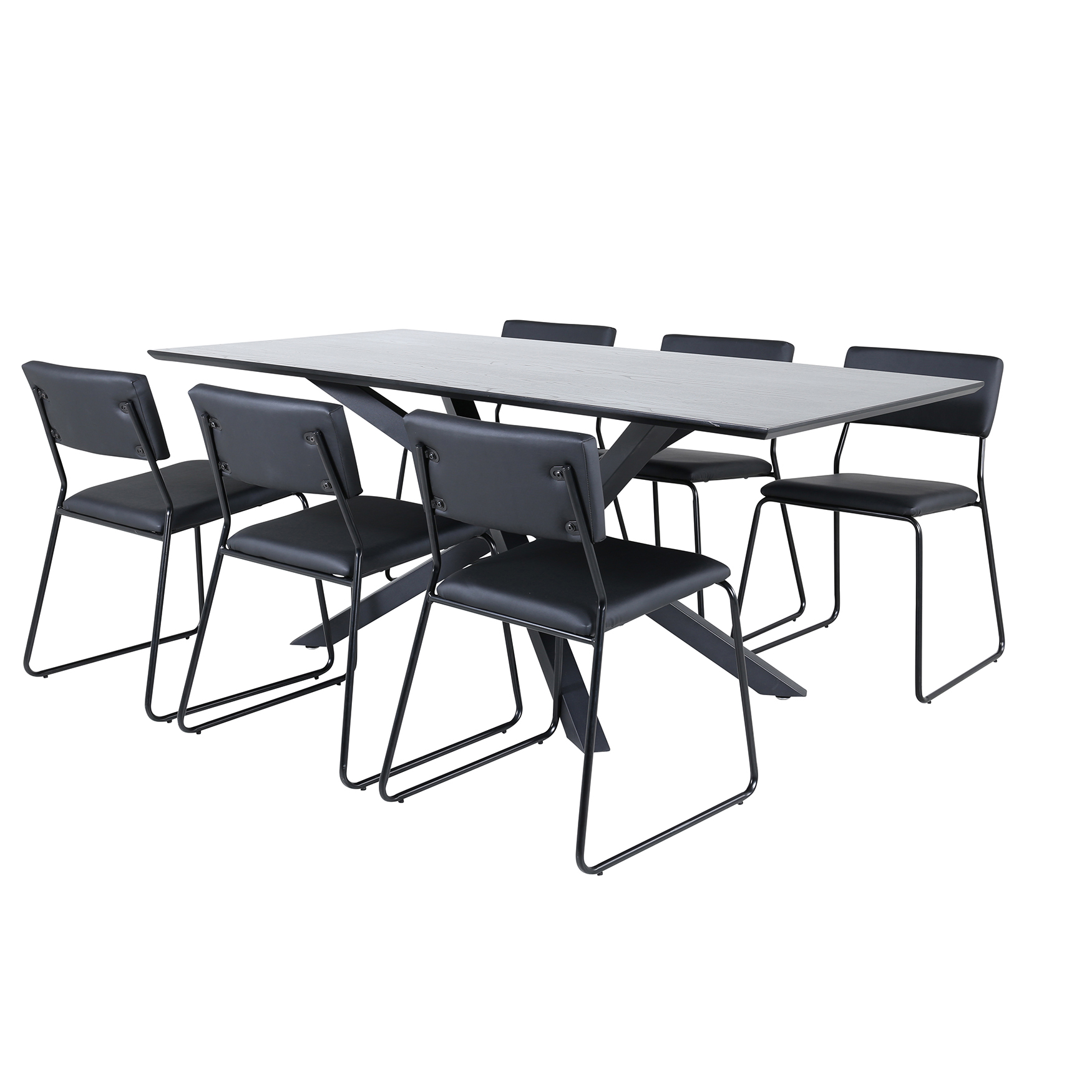 Matgrupp Piata, med ett matbord i MDF med faner med bordsben i järn. Matchas med 6 st Kungshamn matstolar i konstläder.