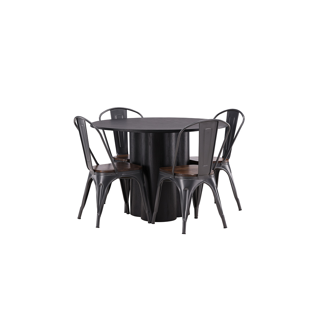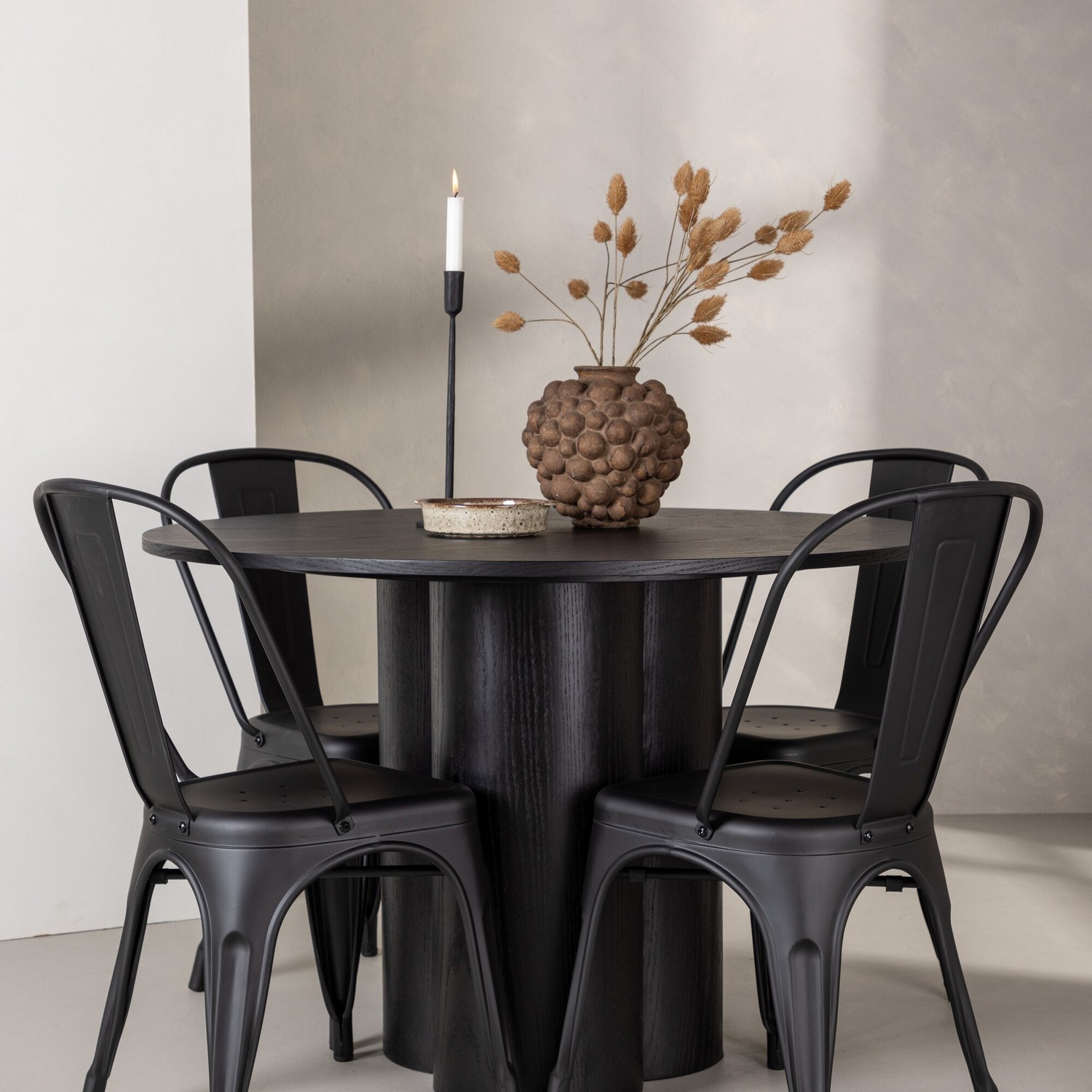 Möblera vardagsrummet snyggt och modernt! Matbord Olivia imponerar med sin Skandinaviska design och smakfulla utformning. Bordet har en genomgående helhetsdesign i MDF med en tunn, rund toppskiva och tre cylinderformade ben som sitter samlat under bordets mitt. Stolarna har lätt utsvängda ben som följsamt möter sitsen och ryggstödet i en stilsäker utformning, genomgående tillverkad i metall. Sitsen är i mörkbrunt trä vilket blir en snygg detalj. Njut av trivsamma måltider framöver!