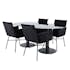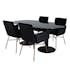 Matgrupp Oslo från Venture Home. Med ett ovalt matbord i svart marmor glas med svarta bordsben i metall. Matchas med 4 st Annika matstolar med svarta stolsben i järn och svarta sitsar i sammet.