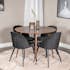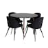Matgrupp Plake med 4 Valentina Stolar Sammet Runt från Venture Home är en elegant matgrupp med ett runt matbord med ben i metall och en bordsskiva av MDF. Det medföljer fyra matstolar med svarta stolsben i metall och sitsar i sammet.