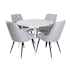 Matgrupp Plake med 4 Vera Stolar Polyestertyg Runt från Venture Home är en stilren matgrupp med ett runt matbord med ben i metall och en bordsskiva av MDF. Det medföljer fyra matstolar med stolsben i metall och sitsar i polyester.