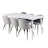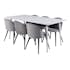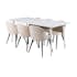 Matgrupp Pobbie med 6 Valentina Stolar Sammet från Venture Home är en elegant matgrupp med ett rektangulärt matbord med ben i metall med en bordsskiva i MDF. Det medföljer sex matstolar med svarta stolsben i metall och sitsar i sammet.