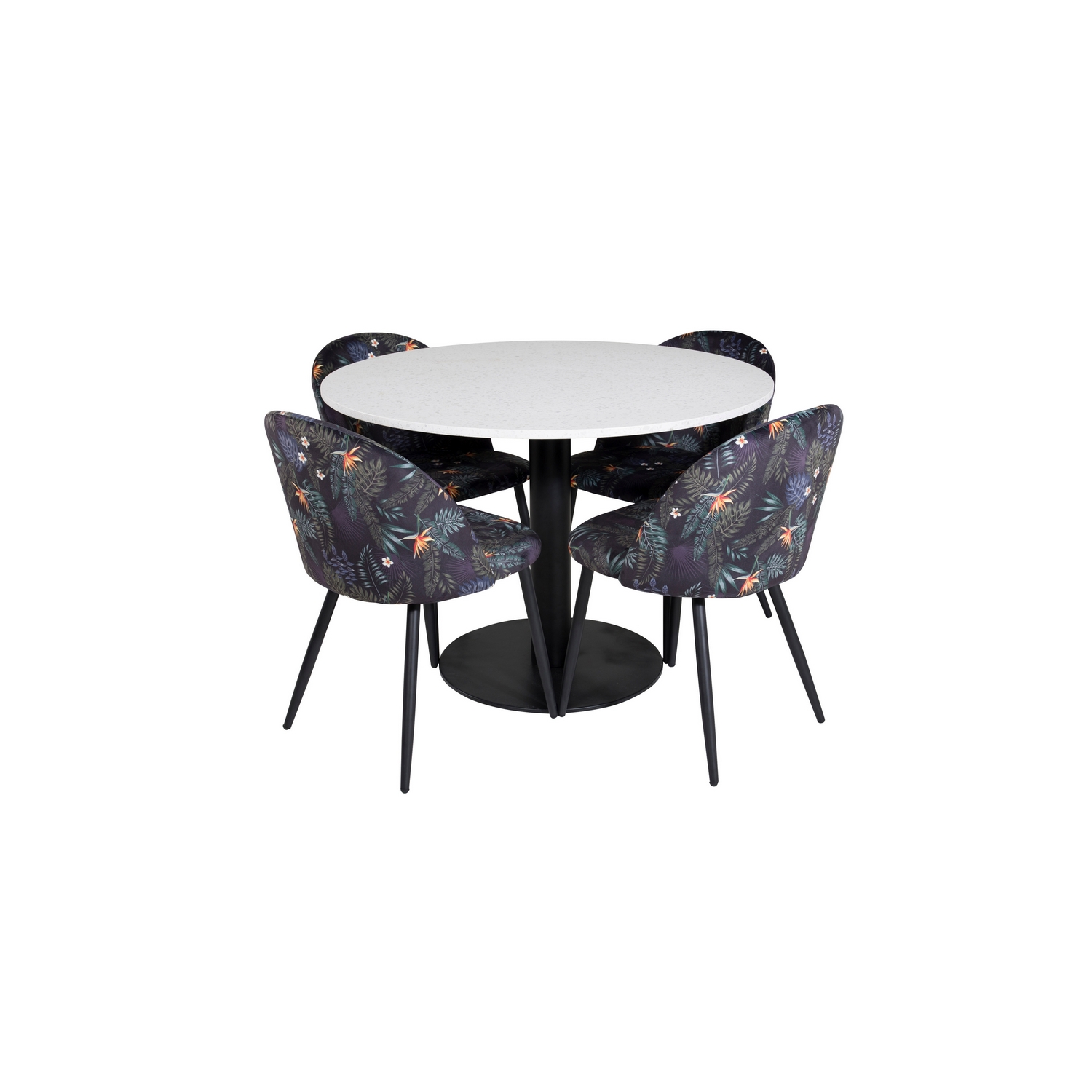 Matgrupp Venture Home Roxanna med 4 Valentina Stolar Polyestertyg Runt är en elegant matgrupp med ett runt matbord i stilren, modern design med trumpetfot i pulverlackad metall och en snygg bordsskiva i grå Terrazzo. Det medföljer fyra matstolar med en helklädd design, ben i svart pulverlackerad metall samt rundad rygg och sits i polyestertyg. Rygg och sits har mjuk stoppning. Lättare montering krävs.