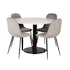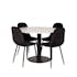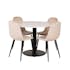 Matgrupp Roxanna Vit Bord med 4 Pobbie Stolar Sammet från Venture Home är en stilren matgrupp med ett runt matbord med en vit terazzo-bordsskiva och svart underrede i metall samt fyra Pobbie-matstolar i sammet.