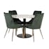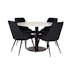 Matgrupp Venture Home Roxanna är en elegant matgrupp med ett runt matbord i vit terazzo bordsskiva och svart underrede i metall tillsammans med fyra stycken Vera matstolar i sammet.