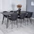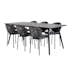 Matgrupp Salt med 6 Valor Stolar från Venture Home är en elegant matgrupp med ett rektangulärt matbord med en stomme och ben i svart pulverlackerad metall med en bordsskiva designad i två delar, i lättborstad svart ekfanér med en kärna av MDF. Bordet kan kompletteras med en iläggsskiva, den ingår ej. Det medföljer sex matstolar med en stomme och ben i svart pulverlackerad metall, i en snygg design med rund rygg. Stolarna har en rygg och sits i stoppat polyestertyg. Lättare montering krävs.
