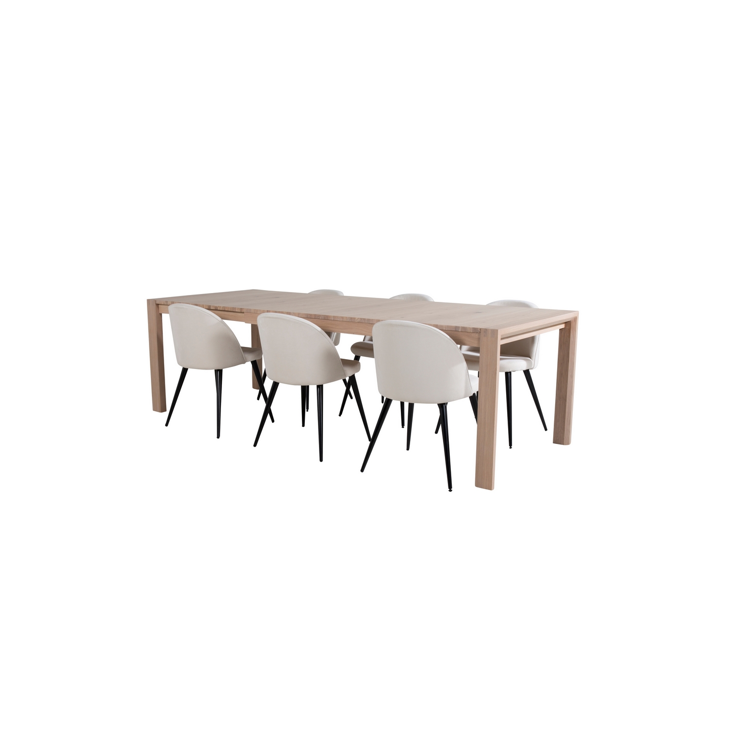 Matgrupp Venture Home Shy med 6 Valentina Matstolar är en matgrupp med ett förlängningsbart bord i stilren och modern design med en bordskiva i ekfanér. Det medföljer sex stilrena matstolar. Lättare montering krävs.