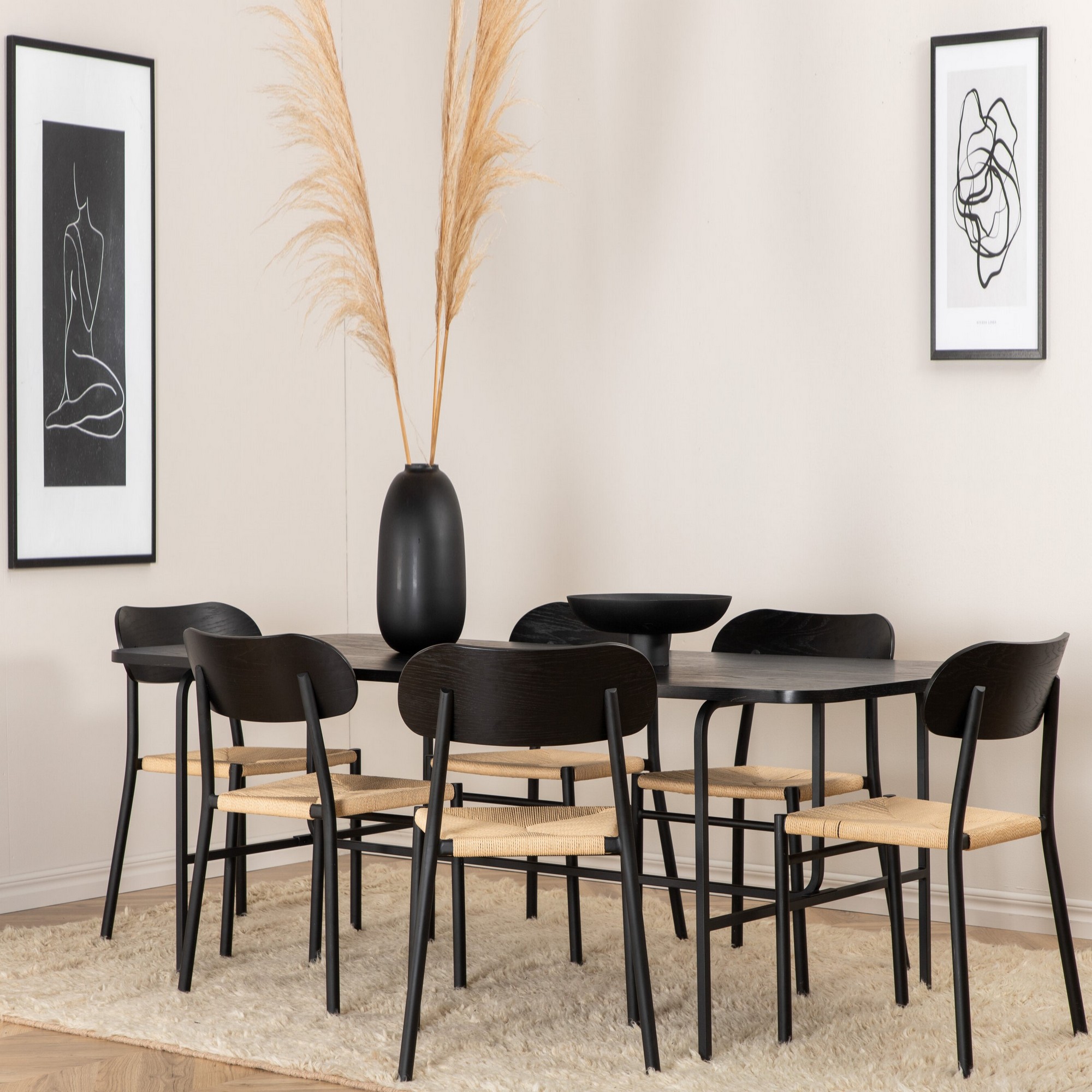 En läckert matchande matgrupp i modern design! Här kombineras Venture Homes omtyckta matbord Uno med de läckra matstolarna från serien Polly. Bordet har en toppskiva i svart MDF med faner samt svarta bordsben i metall - klassiskt rektangulärt matbord med lätt rundade hörn. Tillkommer gör 6st Polly matstolar med stolsben i metall och sits i rep. Låt hemmets hjärta präglas av din nya iögonfallande matgrupp.